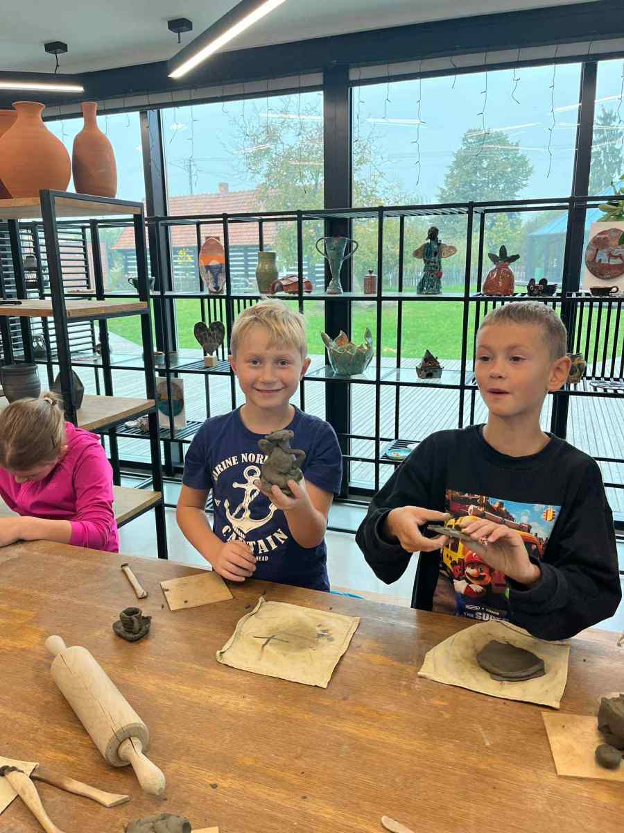Uczniowie klas II naszej szkoły wzięli udział w wycieczce do Ośrodka Garncarskiego w Medyni Głogowskiej. Jest to wyjątkowe miejsce, w którym przeszłość przenika się z teraźniejszością. Uczniowie dowiedzieli się jak dawniej wykonywano naczynia z gliny. Dzieci miały możliwość obejrzenia starej chaty, przedmiotów i urządzeń, którymi dawniej się posługiwano. Na podwórku widziały konny kierat, który służył do napędzania maszyny mielącej glinę oraz bardzo duży piec, do którego mogły wejść. Największą jednak atrakcją były warsztaty z nauką lepienia i rzeźby w glinie oraz toczenia naczyń na kole garncarskim. Każde dziecko z kawałka gliny mogło ulepić lub wyrzeźbić wszystko to, co sobie wymyśliło. Powstały piękne twory z gliny, takie jak kubki, misy, wazony czy zwierzęta. A po założeniu specjalnego fartucha uczniowie zamieniali się w prawdziwych garncarzy i z pomocą instruktora wykonywali własne naczynie z gliny na prawdziwym kole garncarskim. Wszyscy byli zachwyceni z wykonanych prac. Każdy zabrał swoje dzieło do domu.