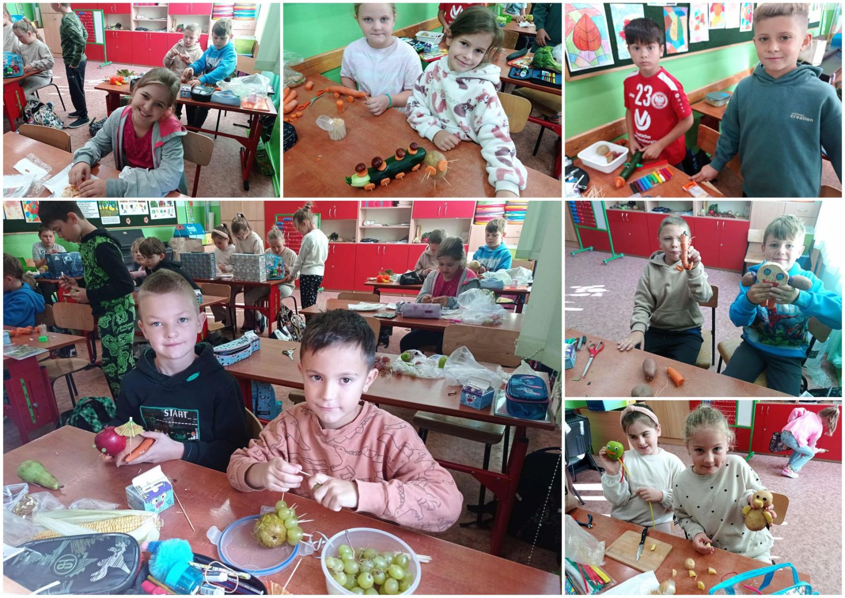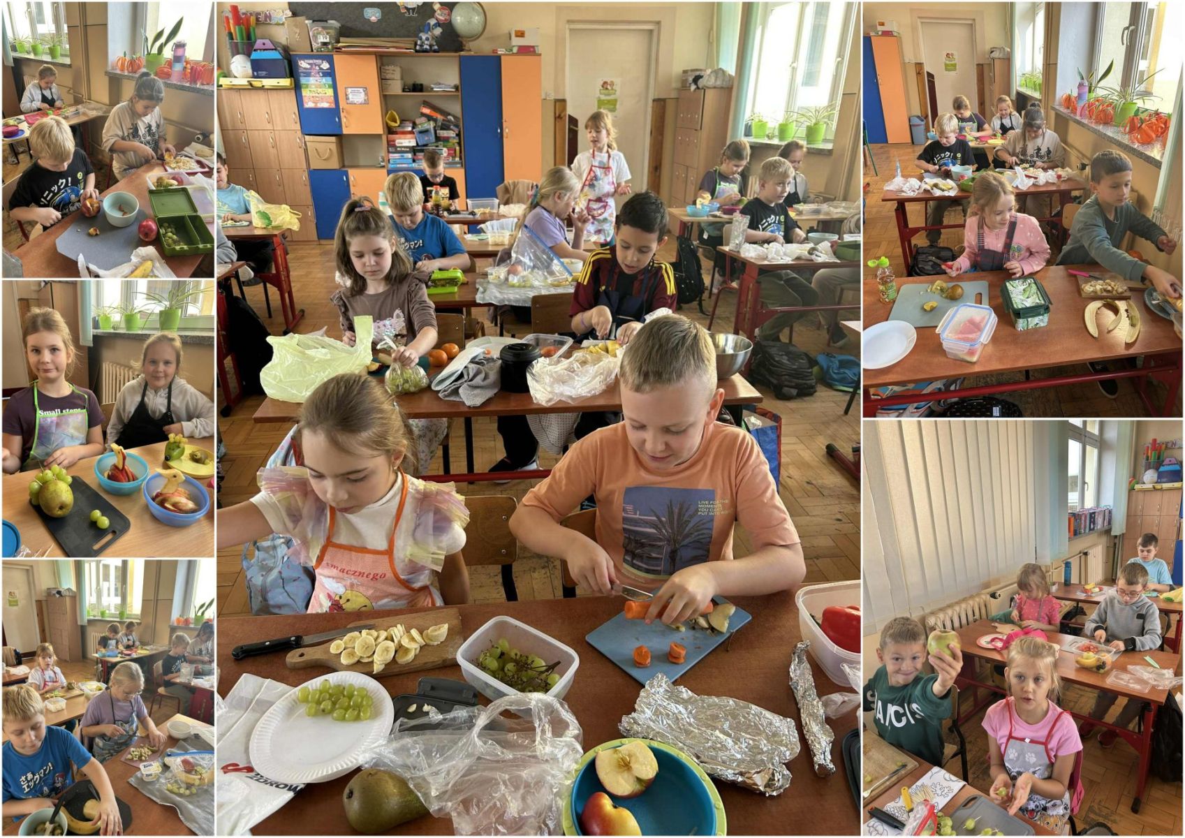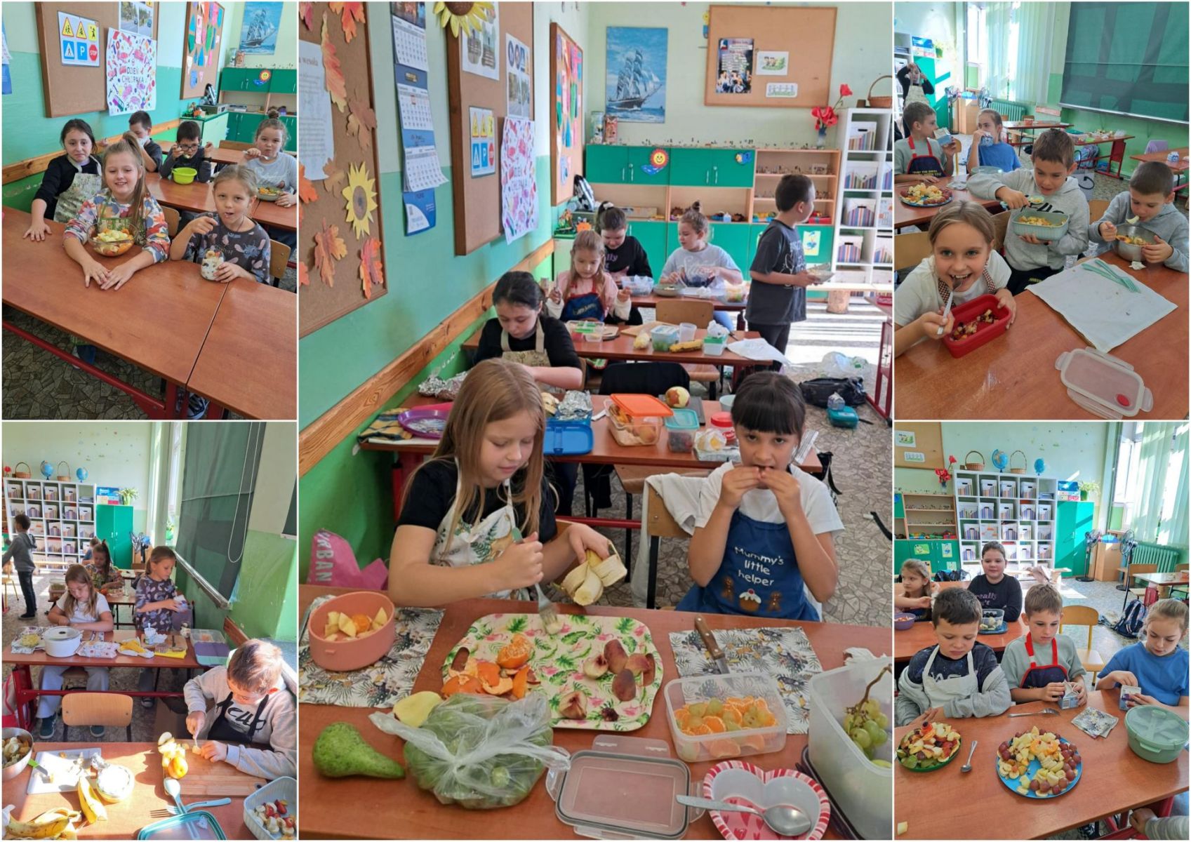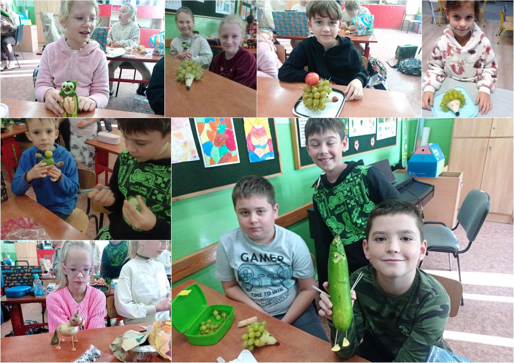 Po przeprowadzeniu lekcji na temat znaczenia owoców i warzyw dla zdrowia człowieka oraz zasad prawidłowego żywienia, uczniowie klas drugich przystąpili do praktycznego działania! Z ogromnym entuzjazmem, kreatywnością i zaangażowaniem, dzieci tworzyły „zwierzaki-cudaki” z przyniesionych przez siebie warzyw i owoców. Pomysłowość uczniów nie miała granic – powstały kolorowe, zabawne i naprawdę oryginalne kompozycje, które nie tylko cieszyły oko, ale też zachęcały do zdrowego odżywiania. Uczniowie samodzielnie przygotowali także zdrową i pyszną sałatkę owocową – prawdziwą bombę witaminową! Wspólna praca sprawiła dzieciom wiele radości.