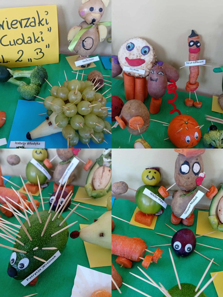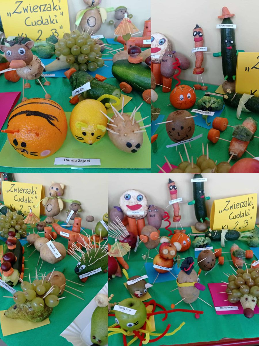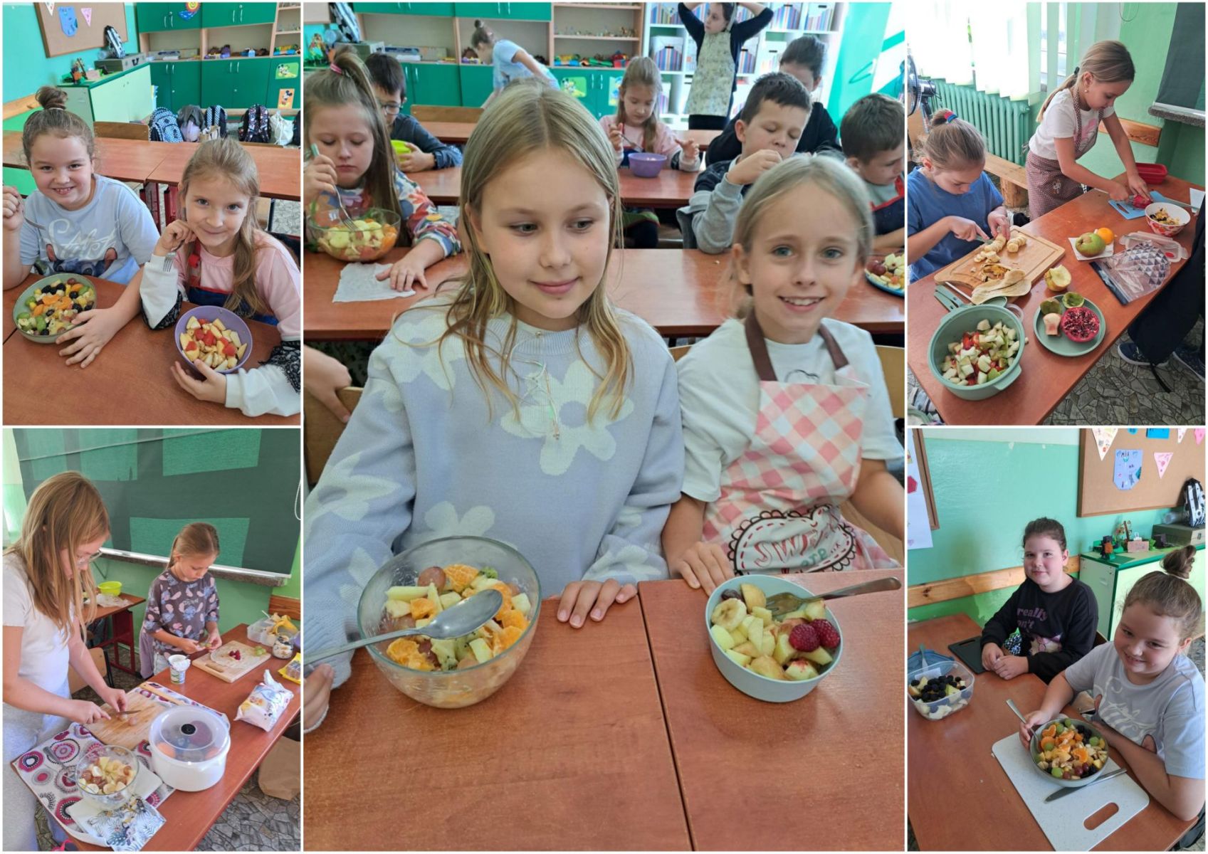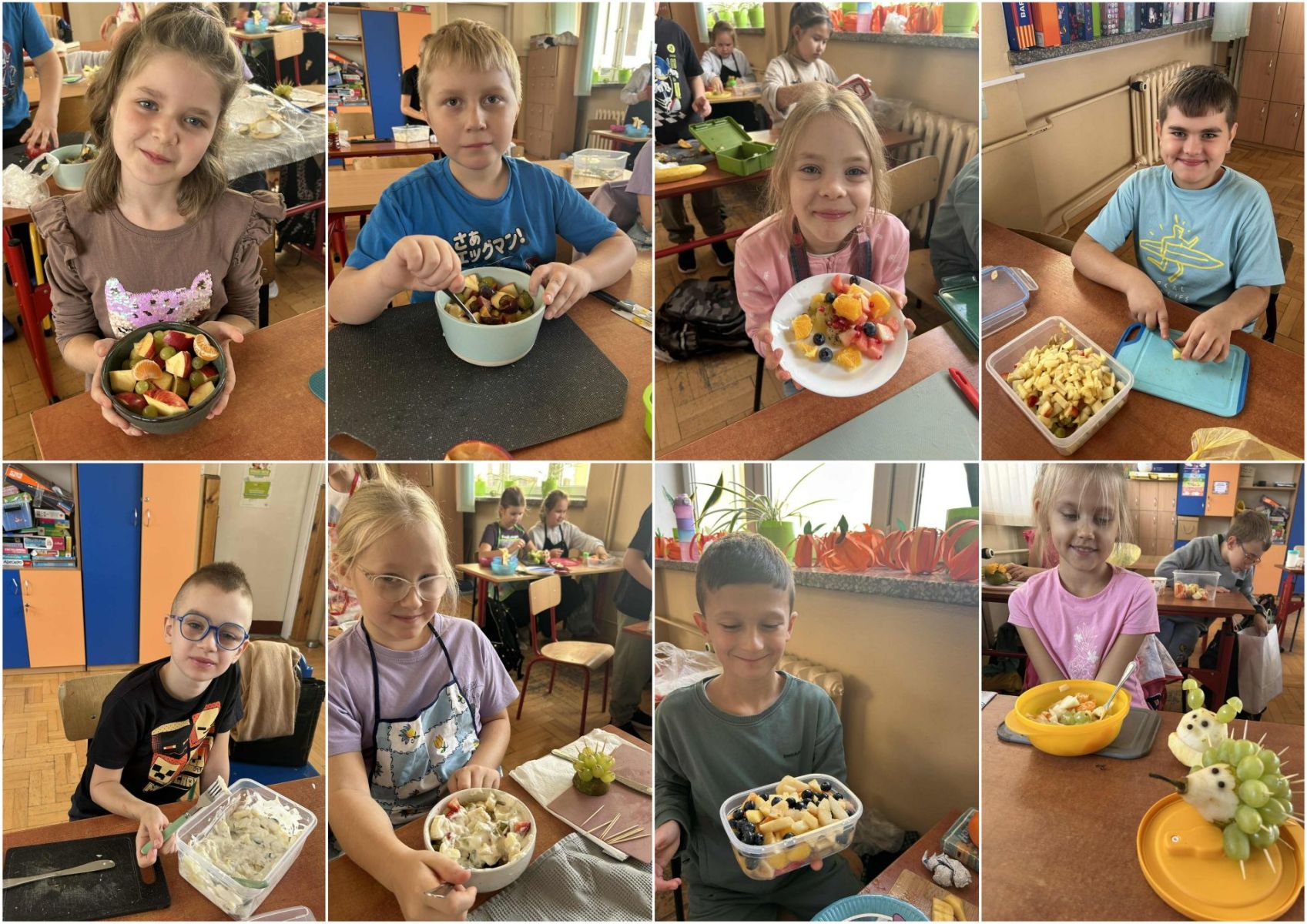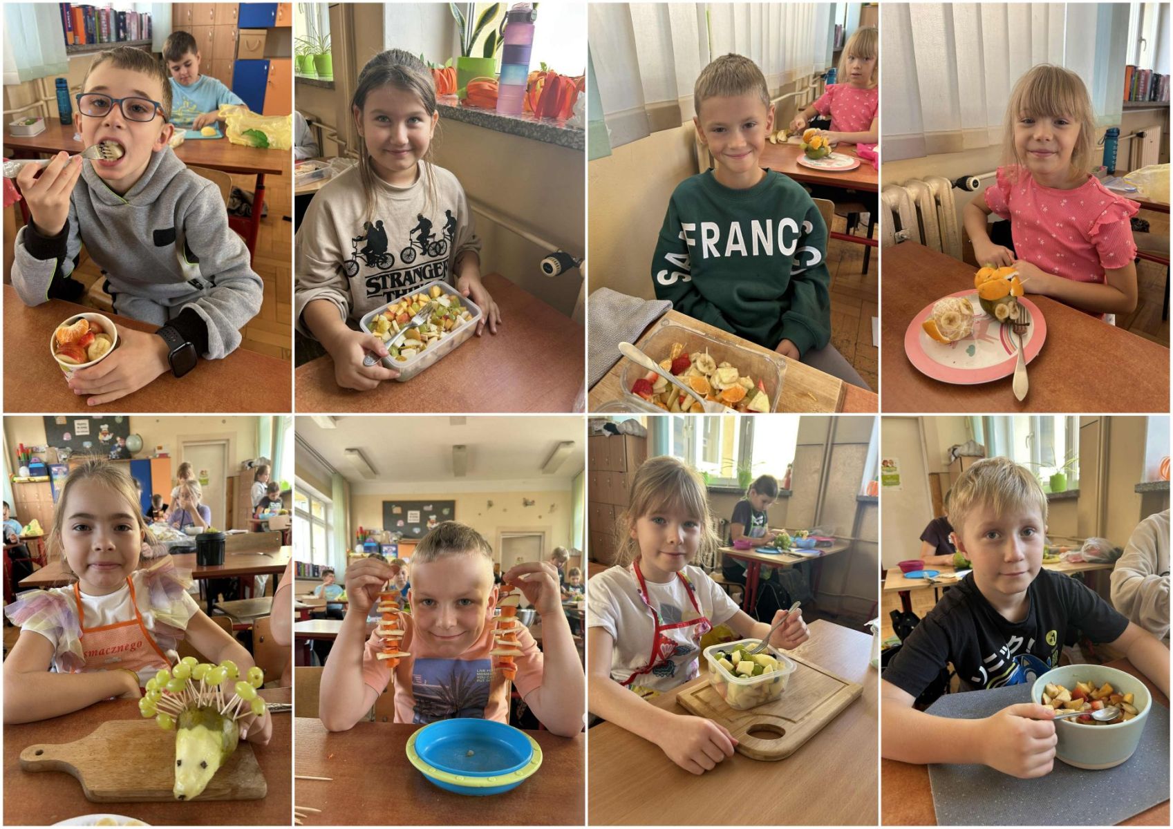 Po przeprowadzeniu lekcji na temat znaczenia owoców i warzyw dla zdrowia człowieka oraz zasad prawidłowego żywienia, uczniowie klas drugich przystąpili do praktycznego działania! Z ogromnym entuzjazmem, kreatywnością i zaangażowaniem, dzieci tworzyły „zwierzaki-cudaki” z przyniesionych przez siebie warzyw i owoców. Pomysłowość uczniów nie miała granic – powstały kolorowe, zabawne i naprawdę oryginalne kompozycje, które nie tylko cieszyły oko, ale też zachęcały do zdrowego odżywiania. Uczniowie samodzielnie przygotowali także zdrową i pyszną sałatkę owocową – prawdziwą bombę witaminową! Wspólna praca sprawiła dzieciom wiele radości.