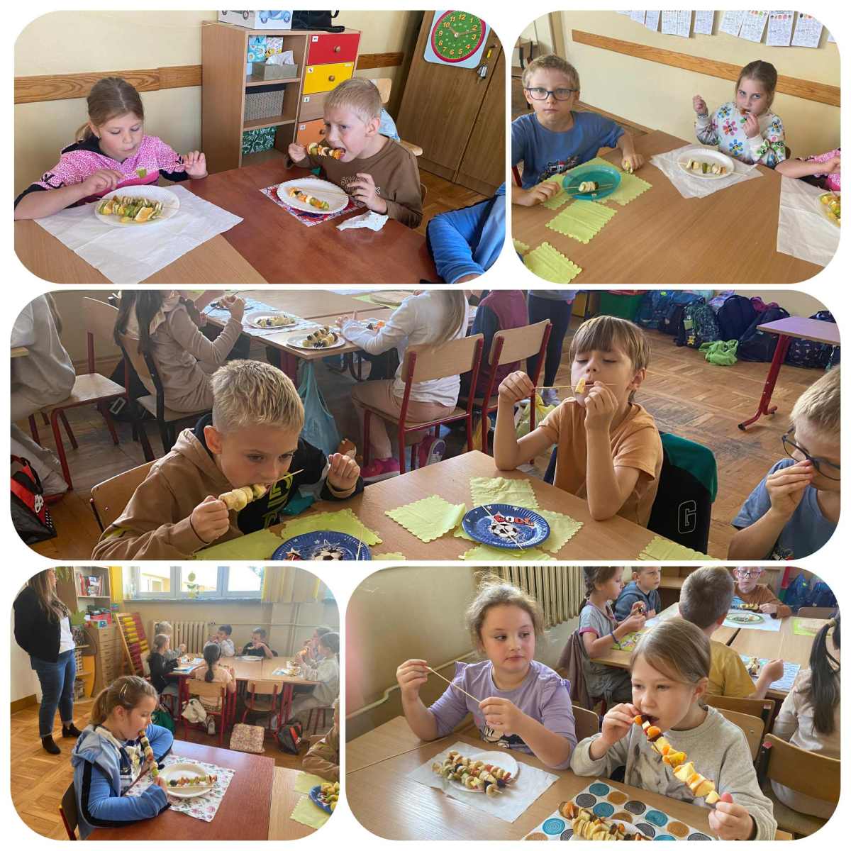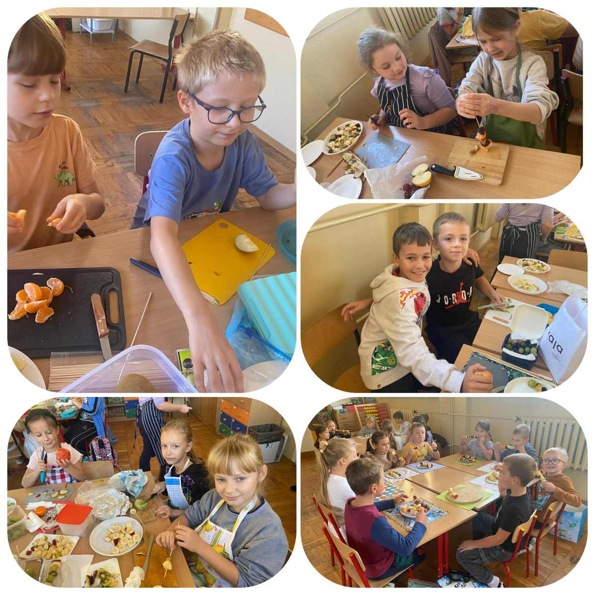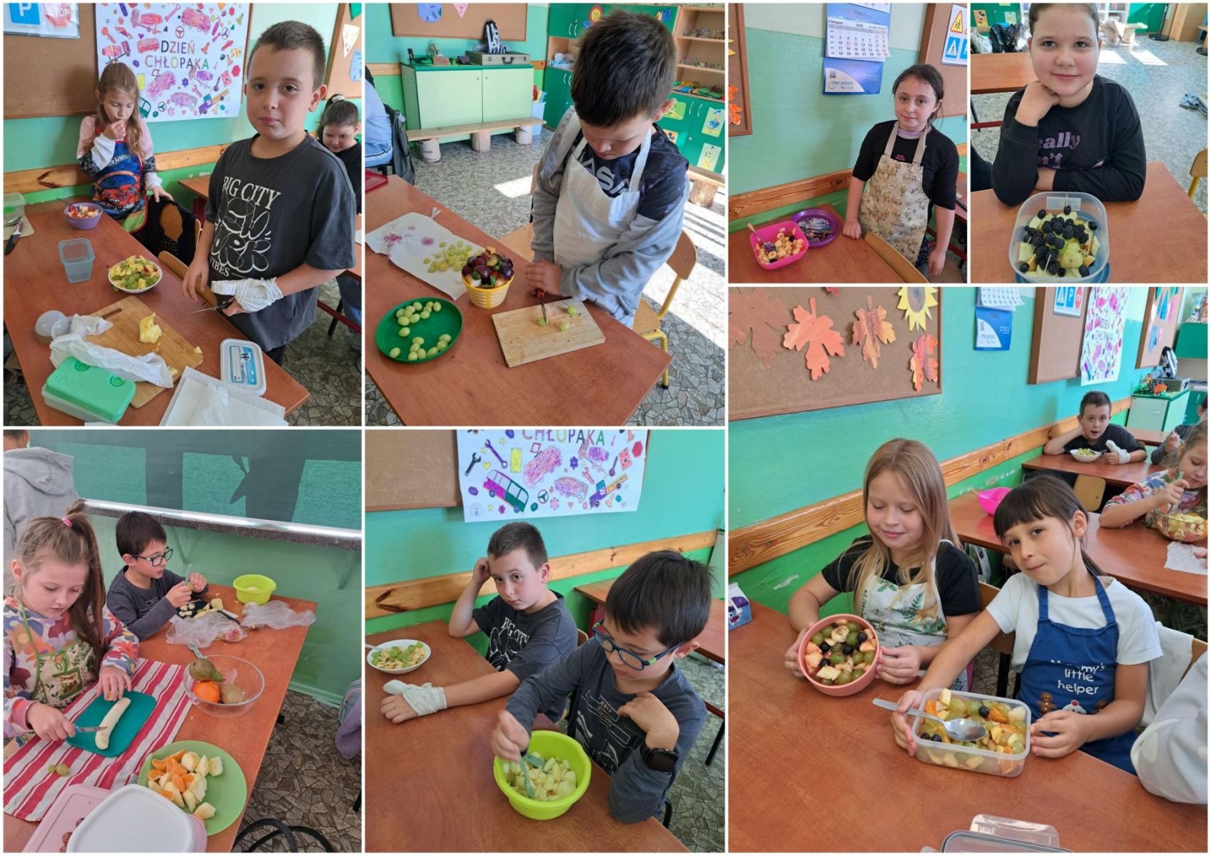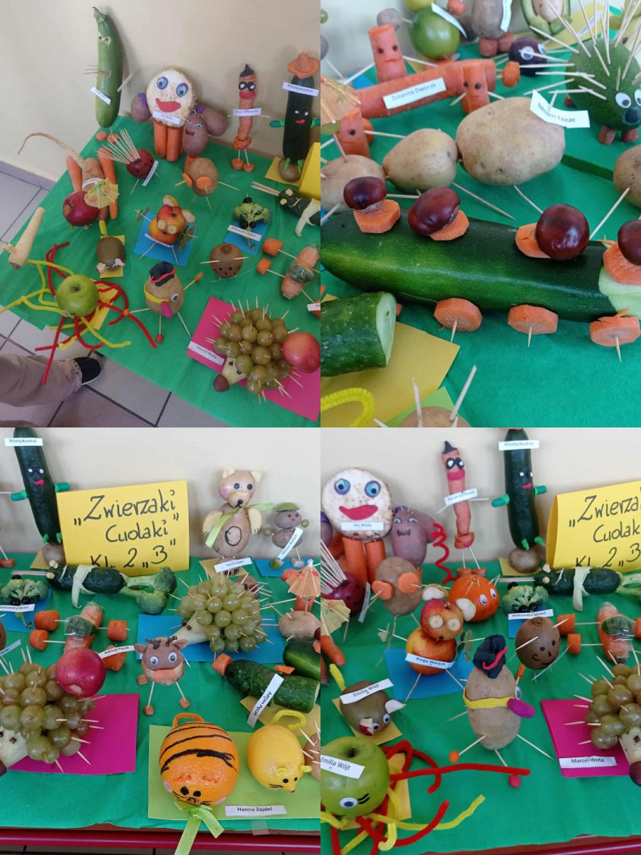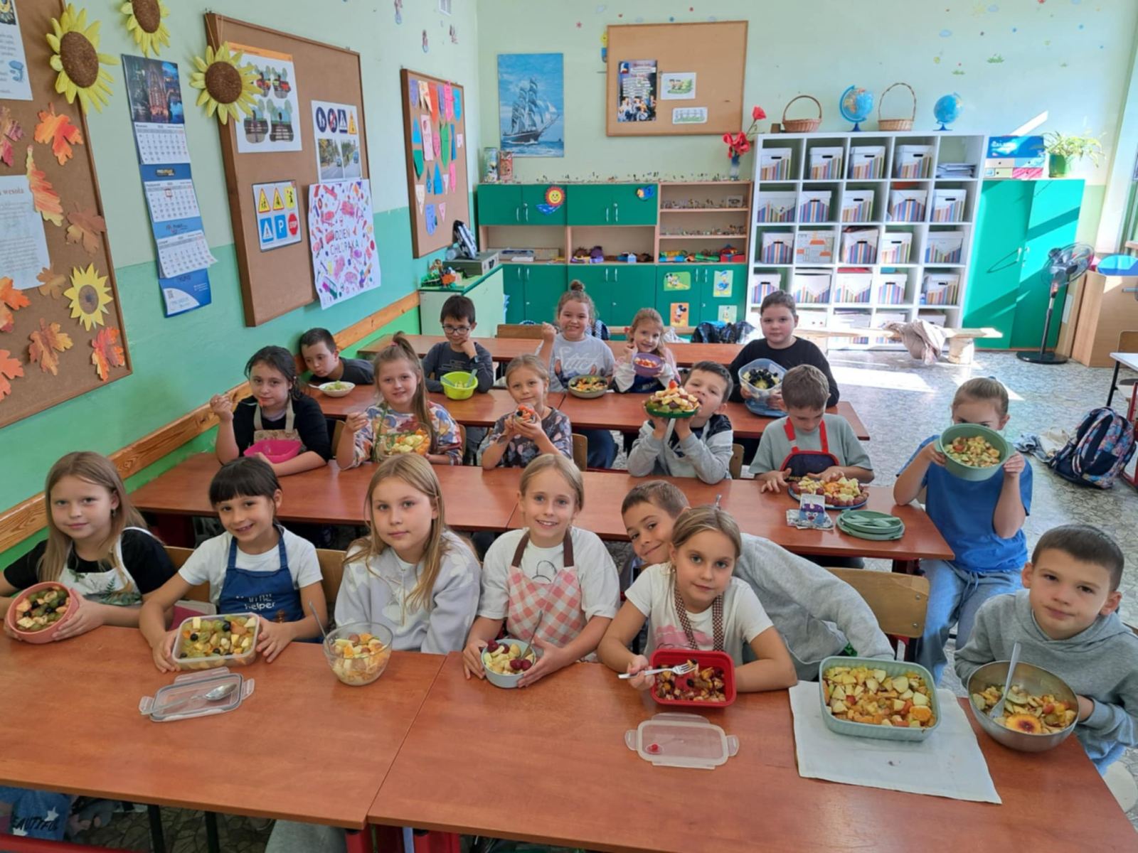 Po przeprowadzeniu lekcji na temat znaczenia owoców i warzyw dla zdrowia człowieka oraz zasad prawidłowego żywienia, uczniowie klas drugich przystąpili do praktycznego działania! Z ogromnym entuzjazmem, kreatywnością i zaangażowaniem, dzieci tworzyły „zwierzaki-cudaki” z przyniesionych przez siebie warzyw i owoców. Pomysłowość uczniów nie miała granic – powstały kolorowe, zabawne i naprawdę oryginalne kompozycje, które nie tylko cieszyły oko, ale też zachęcały do zdrowego odżywiania. Uczniowie samodzielnie przygotowali także zdrową i pyszną sałatkę owocową – prawdziwą bombę witaminową! Wspólna praca sprawiła dzieciom wiele radości.