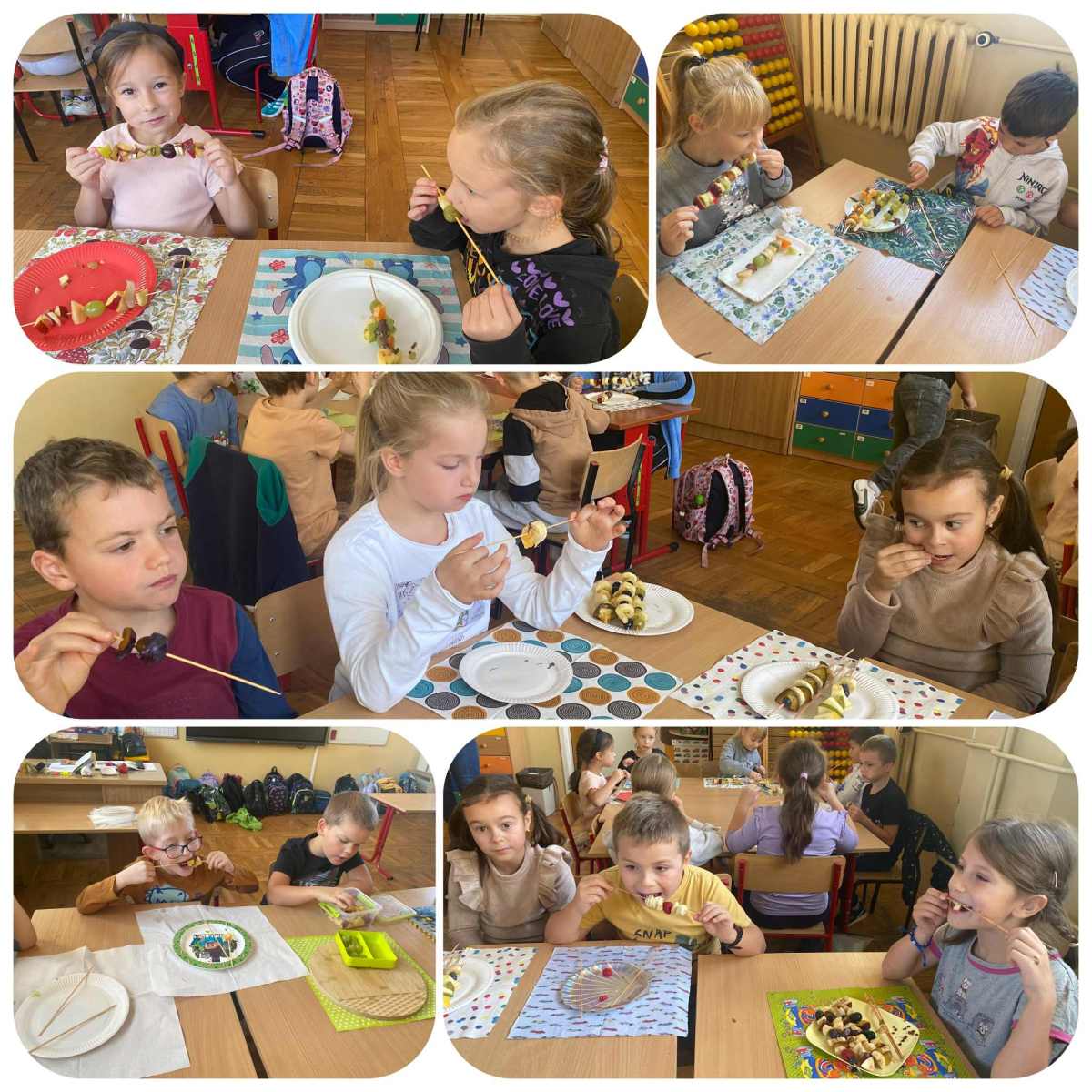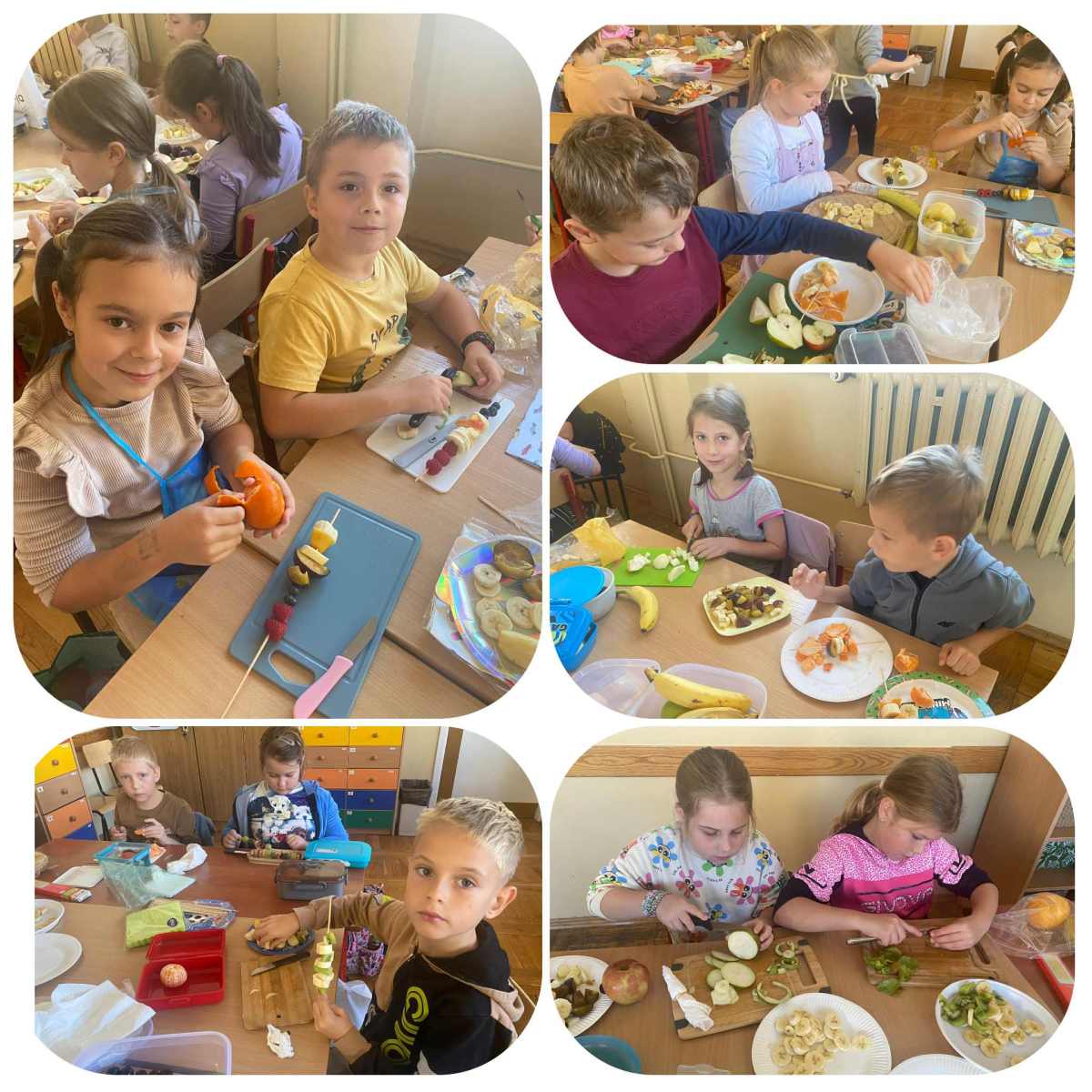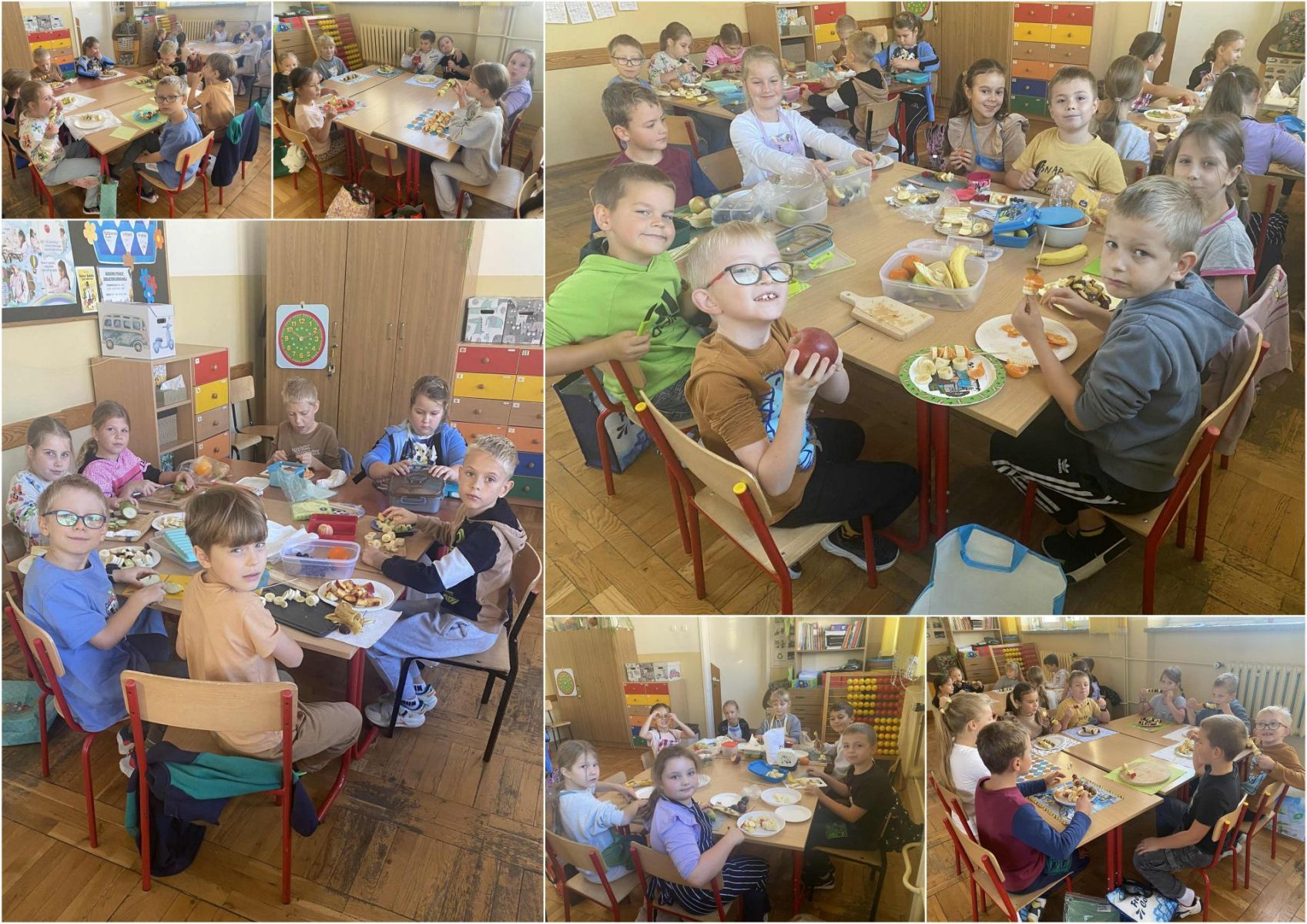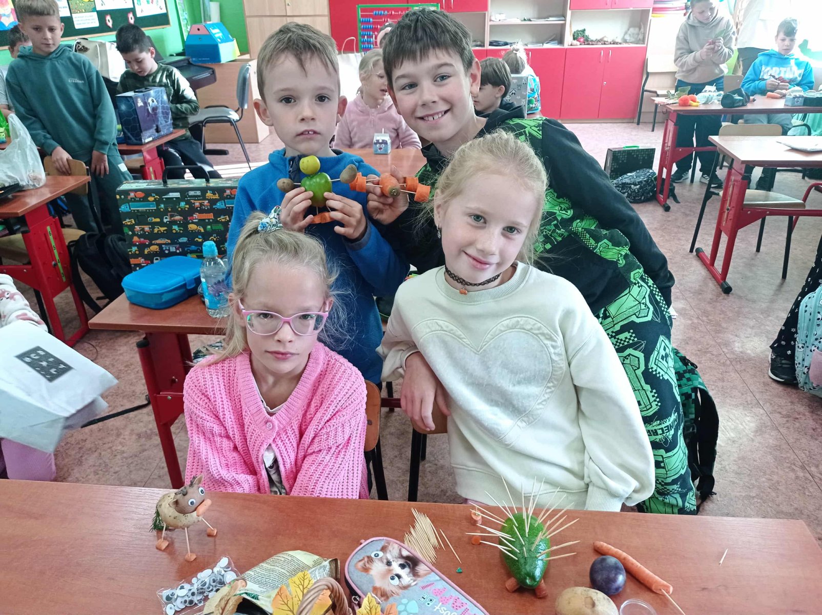 Po przeprowadzeniu lekcji na temat znaczenia owoców i warzyw dla zdrowia człowieka oraz zasad prawidłowego żywienia, uczniowie klas drugich przystąpili do praktycznego działania! Z ogromnym entuzjazmem, kreatywnością i zaangażowaniem, dzieci tworzyły „zwierzaki-cudaki” z przyniesionych przez siebie warzyw i owoców. Pomysłowość uczniów nie miała granic – powstały kolorowe, zabawne i naprawdę oryginalne kompozycje, które nie tylko cieszyły oko, ale też zachęcały do zdrowego odżywiania. Uczniowie samodzielnie przygotowali także zdrową i pyszną sałatkę owocową – prawdziwą bombę witaminową! Wspólna praca sprawiła dzieciom wiele radości.