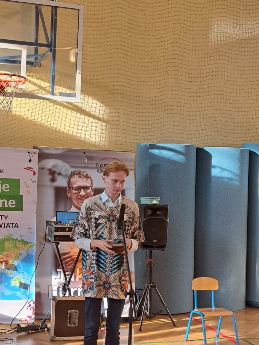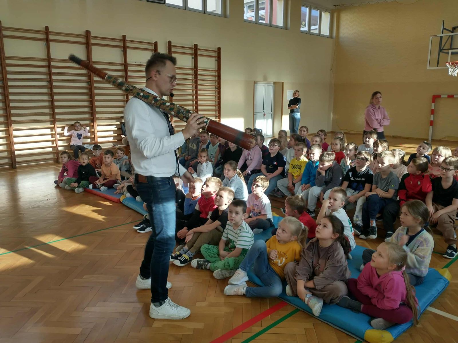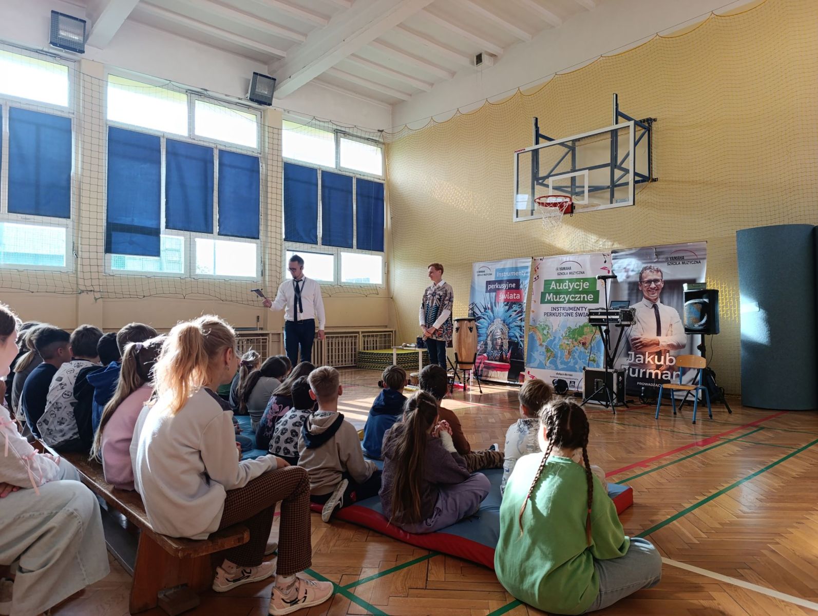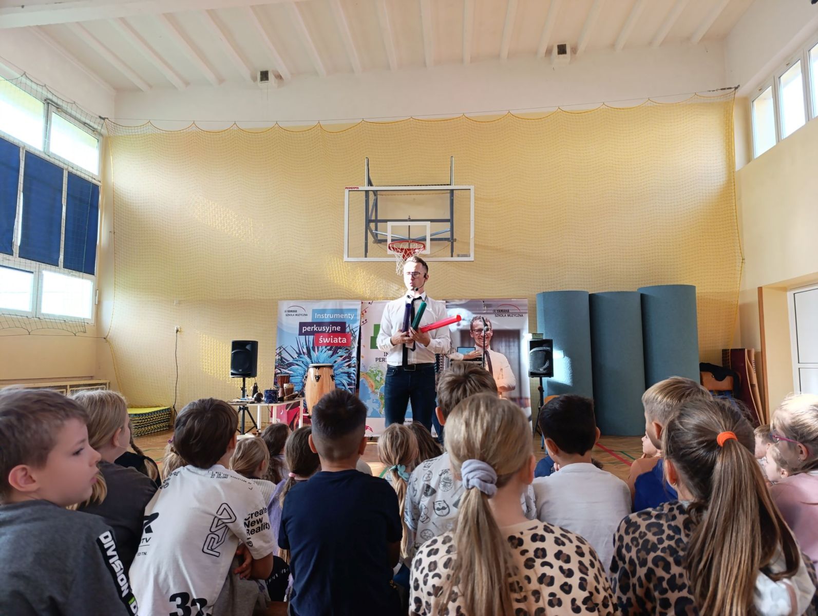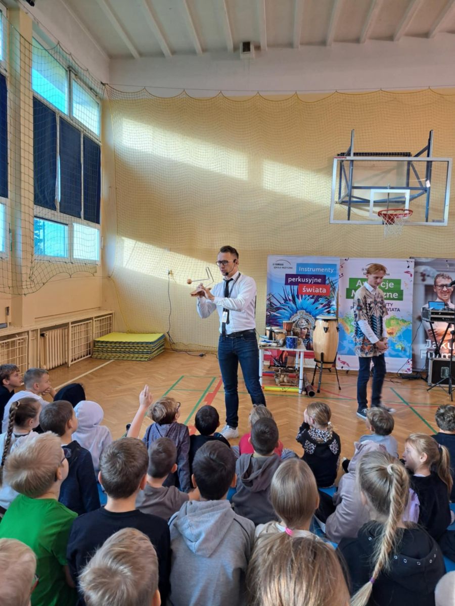 Uczniowie mieli okazję poznać i wypróbować niezwykłe instrumenty – od wesołych Bum Bum rurek, przez żabkę wydającą zabawne rechoty, aż po tajemniczo brzmiący czuringa i drumlę. Nie zabrakło też egzotycznych rytmów tigeridu, wibry, cow bell i konga, a całość dopełniły dźwięki klawesynu, które nadały naszej muzycznej podróży wyjątkowego charakteru.