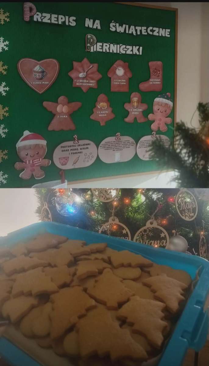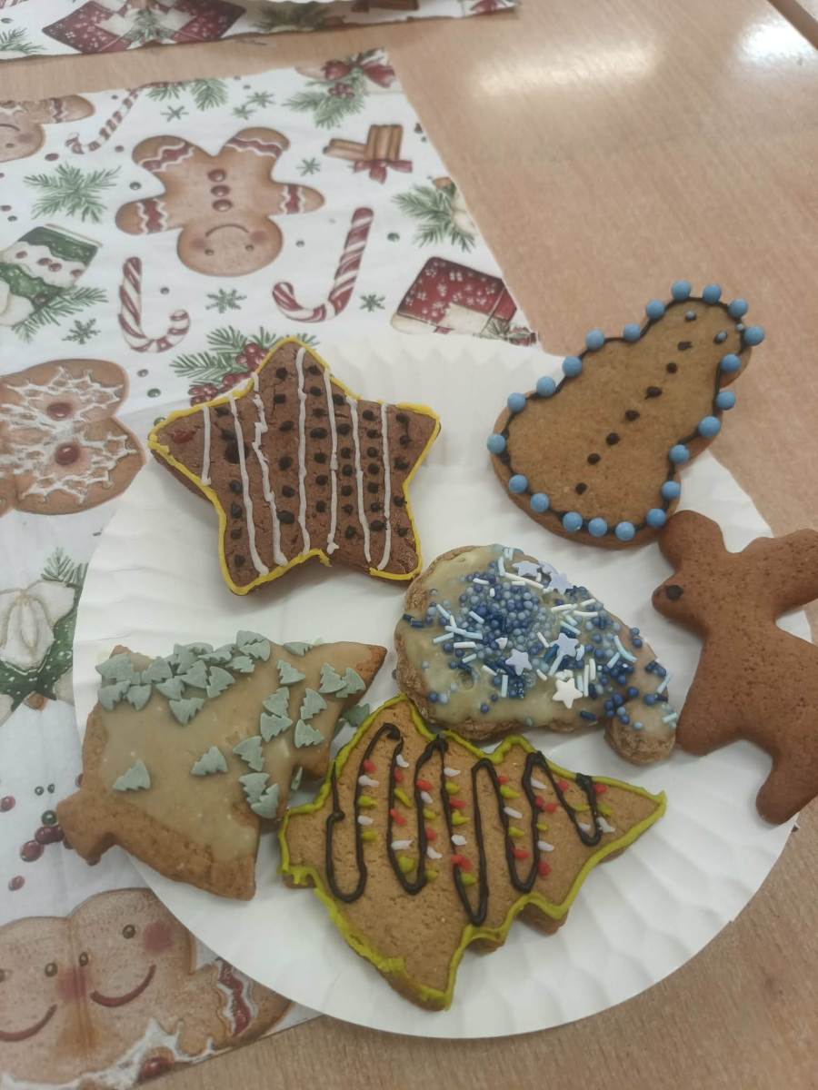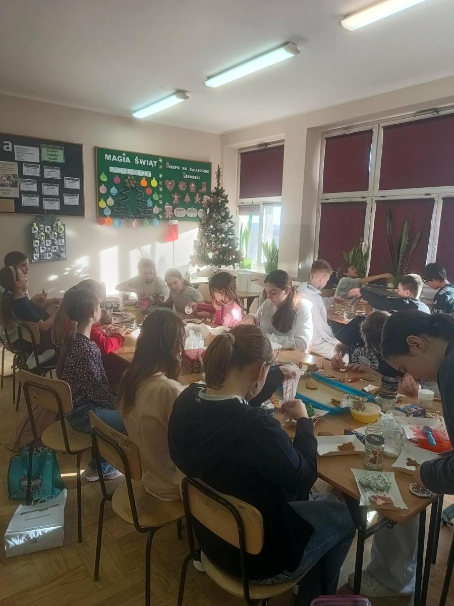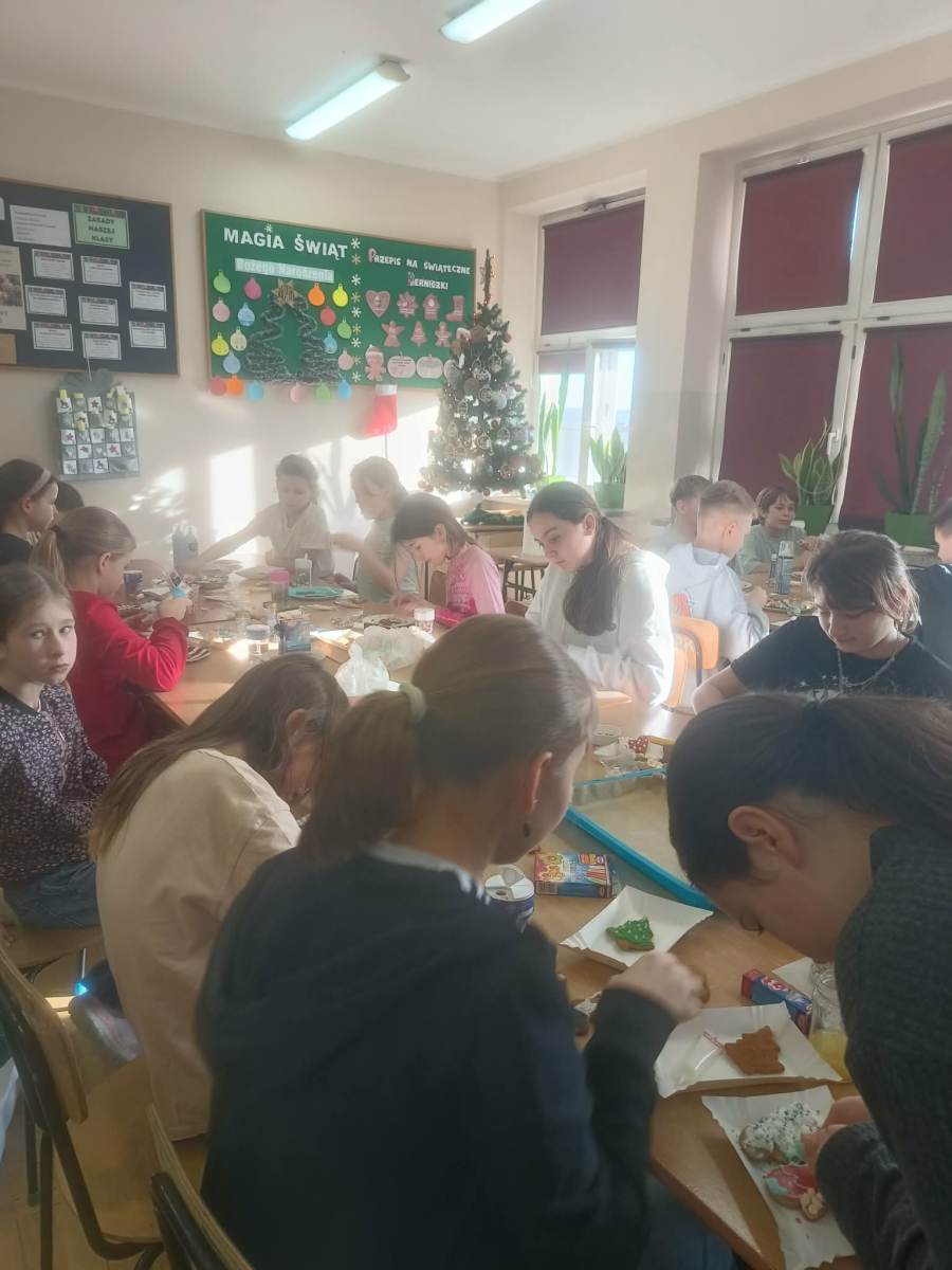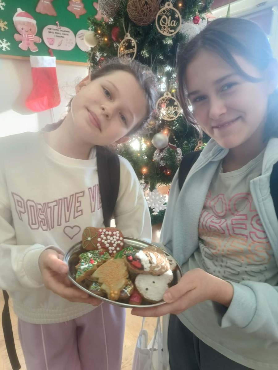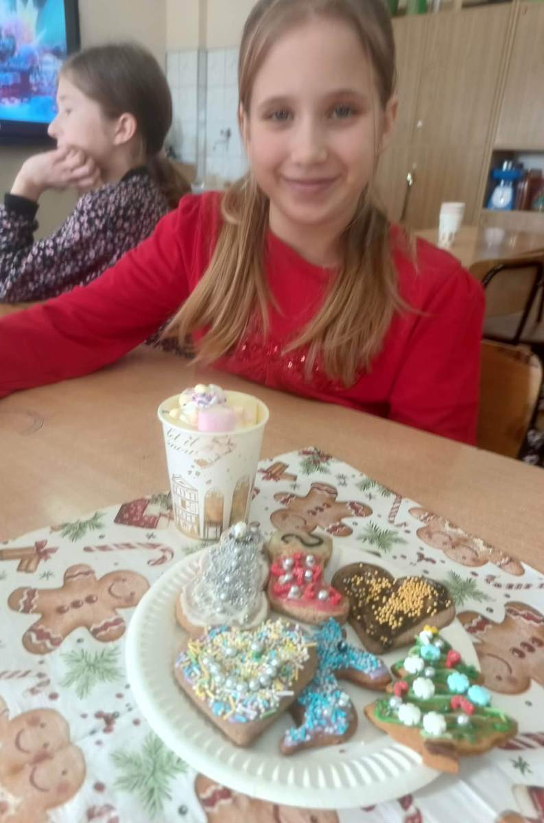 W ramach świątecznych przygotowań klasa 5a zamieniła się w… cukiernię pełną artystów i smakoszy w jednym. Uczniowie z wielkim zaangażowaniem dekorowali pierniczki, które wcześniej upieczono w domowych piekarnikach. Na stołach królował lukier w ilościach hurtowych, posypki we wszystkich kolorach tęczy oraz fantazja, która zdecydowanie nie znała granic. Powstawały pierniki kolorowe, uśmiechnięte, abstrakcyjne… Jedno było pewne – każdy piernik był absolutnie wyjątkowy. W klasie zapanował prawdziwie świąteczny klimat, choć momentami przypominał on pole bitwy z lukrem na rękach, ławkach i… nosach. Uczniowie pomagali sobie nawzajem, dzielili się pomysłami i przede wszystkim świetnie się bawili. Po zakończeniu prac artystycznych nadszedł najbardziej wyczekiwany moment – degustacja! Całość dopełnił kubeczek gorącej czekolady, który skutecznie rozgrzał atmosferę i brzuchy. Była to wyjątkowo udana, pełna śmiechu, ciepła i słodkości przedświąteczna godzina wychowawcza.