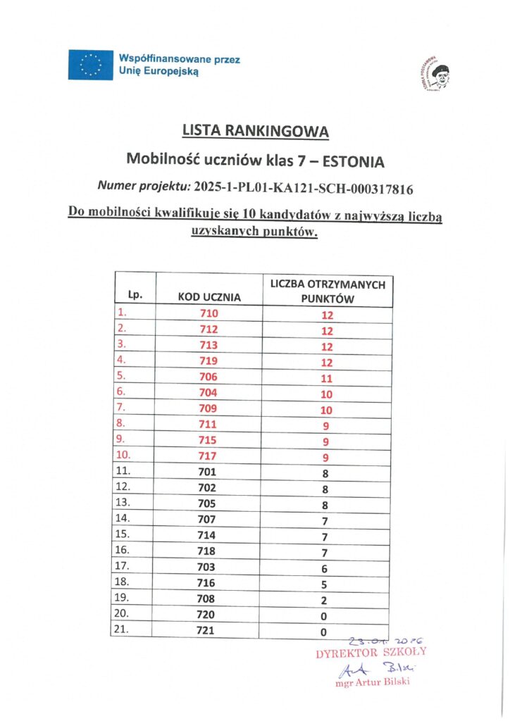 Lista rankingowa kandydatów projektu Erasmus+