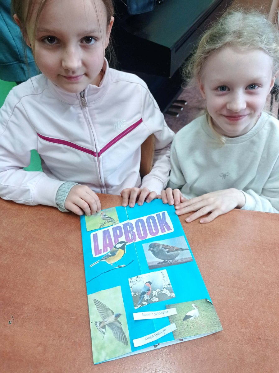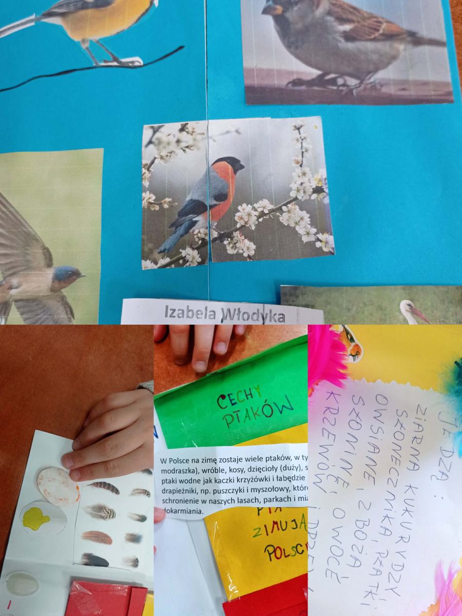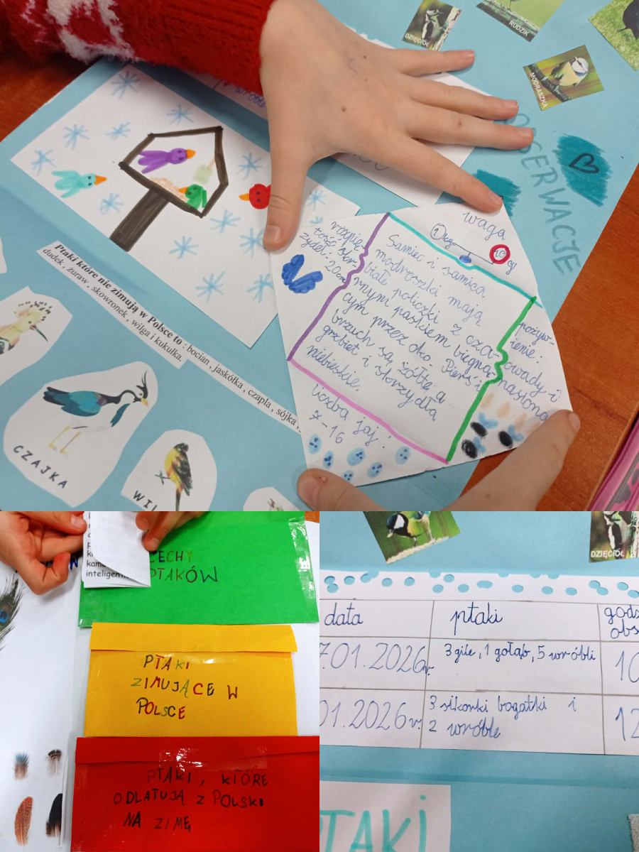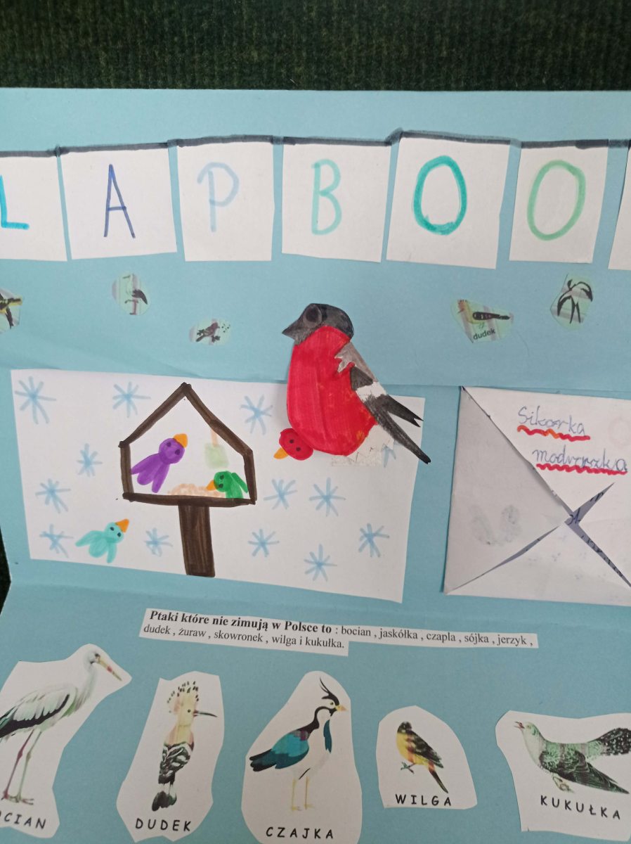 W ramach omawianego bloku tematycznego „Ptaki zimą”, uczniowie klasy 2b stworzyli lapbooki. Celem tego zadania było nie tylko zapoznanie się z ptakami zimującymi w Polsce, ale także utrwalenie zdobytej wiedzy w kreatywny sposób. Uczniowie zapoznali się z różnymi gatunkami zimującymi u nas ptaków, ich zwyczajami, sposobami przetrwania trudów mroźnej pory roku oraz ich rolą w ekosystemie. Uczestnicy zajęć przygotowali zdjęcia ptaków, napisali krótkie notatki na ich temat, wyszukiwali informacje w atlasach ptaków. Dzięki tej formie wspólnych działań nie tylko zapamiętali, które ptaki zostają w Polsce na zimę, ale również zdobyli informacje dotyczące ich charakterystyki, nawyków oraz warunków życia. Tworzenie lapbooka okazało się bardzo efektywną metodą pracy: uczniowie nie tylko zdobyli i utrwalili swoją wiedzę, ale również rozwinęli umiejętności kreatywne oraz manualne. Za oknem ustawiliśmy karmnik i zadbaliśmy o to, aby nie zabrakło w nim smakowitych ziarenek. Teraz będziemy mieli możliwość obserwowania ptaków przylatujących do „ptasiej stołówki”.