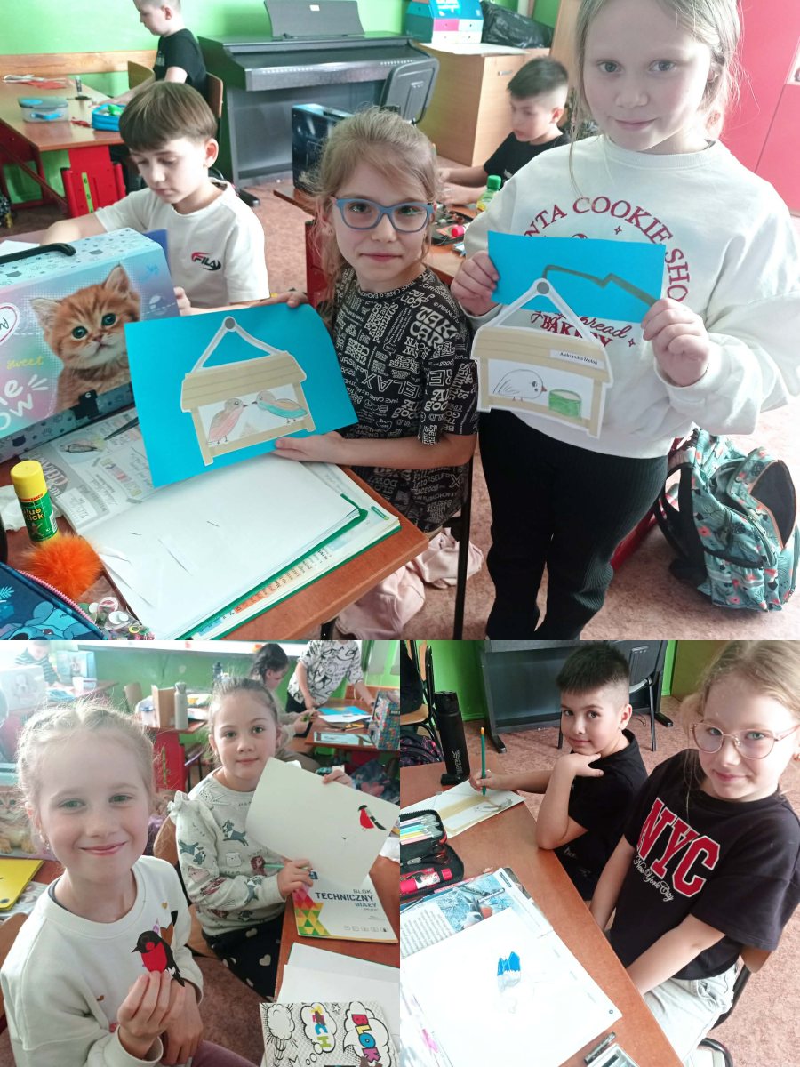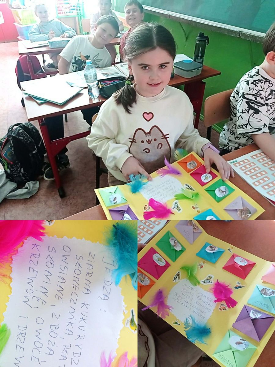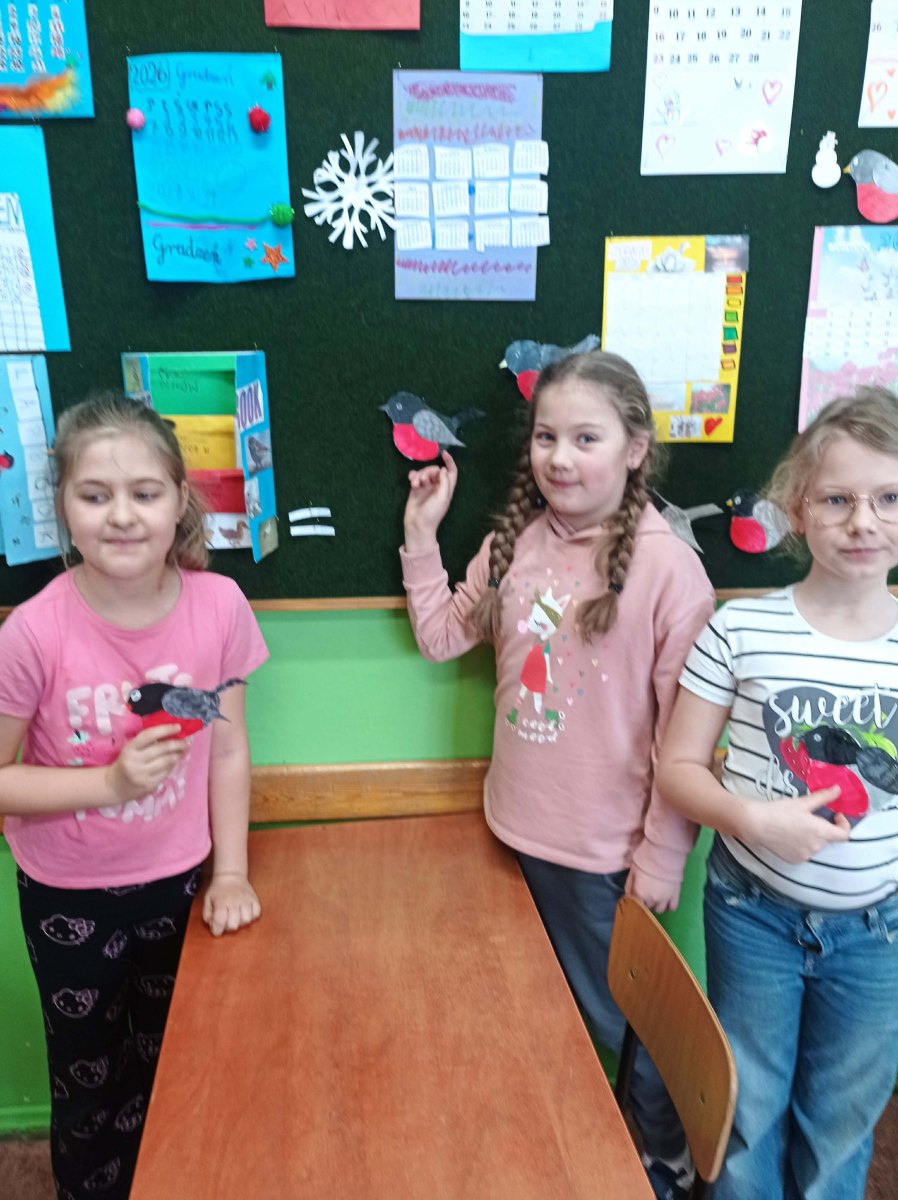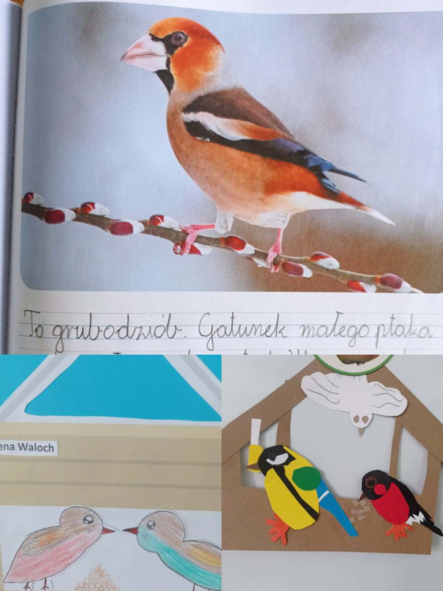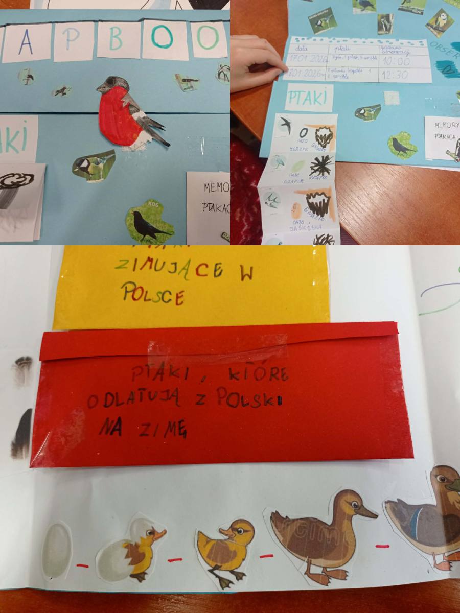 W ramach omawianego bloku tematycznego „Ptaki zimą”, uczniowie klasy 2b stworzyli lapbooki. Celem tego zadania było nie tylko zapoznanie się z ptakami zimującymi w Polsce, ale także utrwalenie zdobytej wiedzy w kreatywny sposób. Uczniowie zapoznali się z różnymi gatunkami zimującymi u nas ptaków, ich zwyczajami, sposobami przetrwania trudów mroźnej pory roku oraz ich rolą w ekosystemie. Uczestnicy zajęć przygotowali zdjęcia ptaków, napisali krótkie notatki na ich temat, wyszukiwali informacje w atlasach ptaków. Dzięki tej formie wspólnych działań nie tylko zapamiętali, które ptaki zostają w Polsce na zimę, ale również zdobyli informacje dotyczące ich charakterystyki, nawyków oraz warunków życia. Tworzenie lapbooka okazało się bardzo efektywną metodą pracy: uczniowie nie tylko zdobyli i utrwalili swoją wiedzę, ale również rozwinęli umiejętności kreatywne oraz manualne. Za oknem ustawiliśmy karmnik i zadbaliśmy o to, aby nie zabrakło w nim smakowitych ziarenek. Teraz będziemy mieli możliwość obserwowania ptaków przylatujących do „ptasiej stołówki”.
