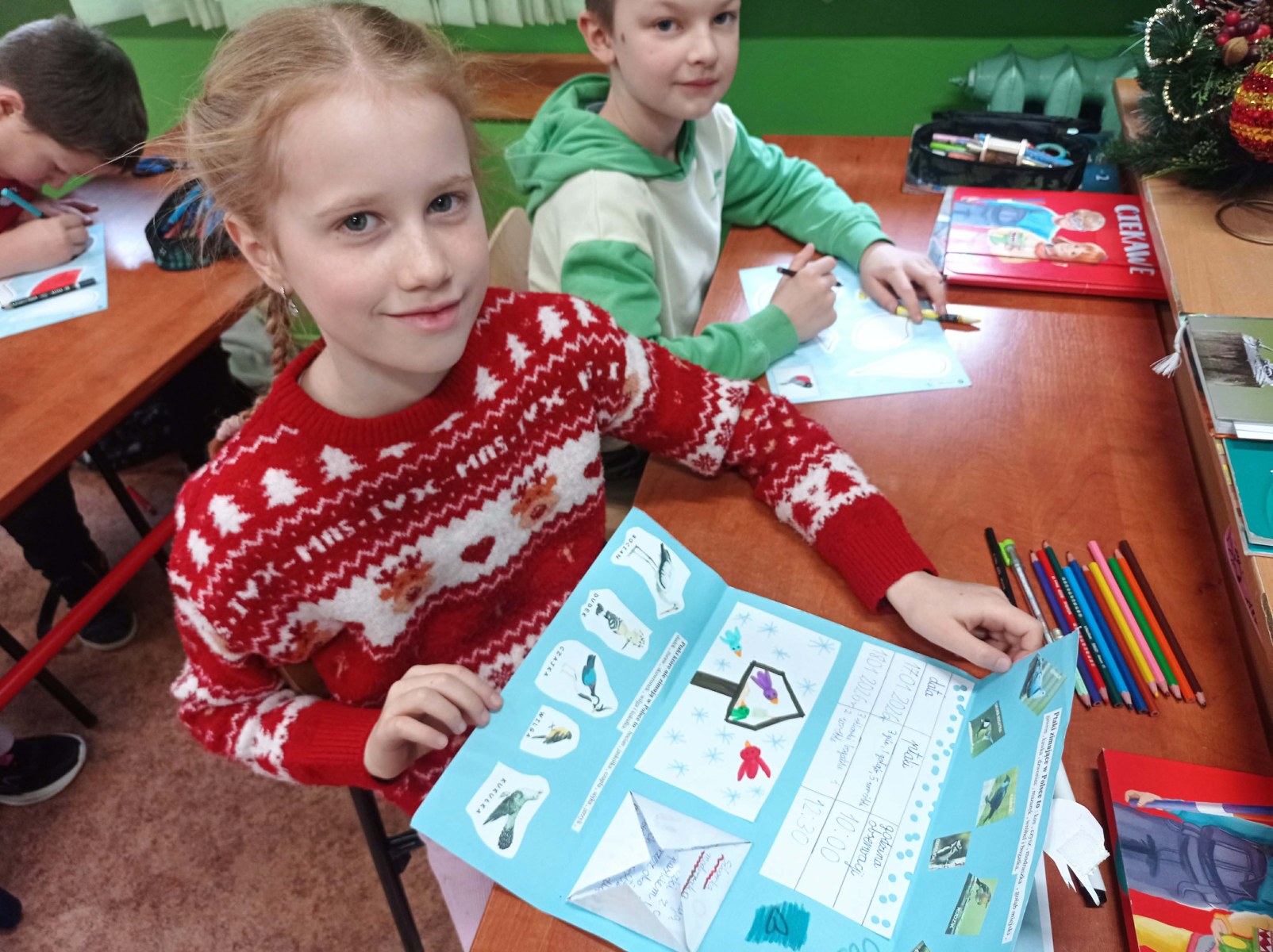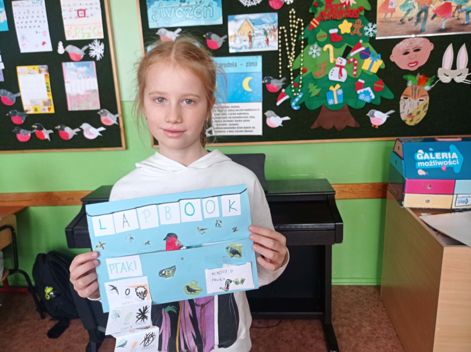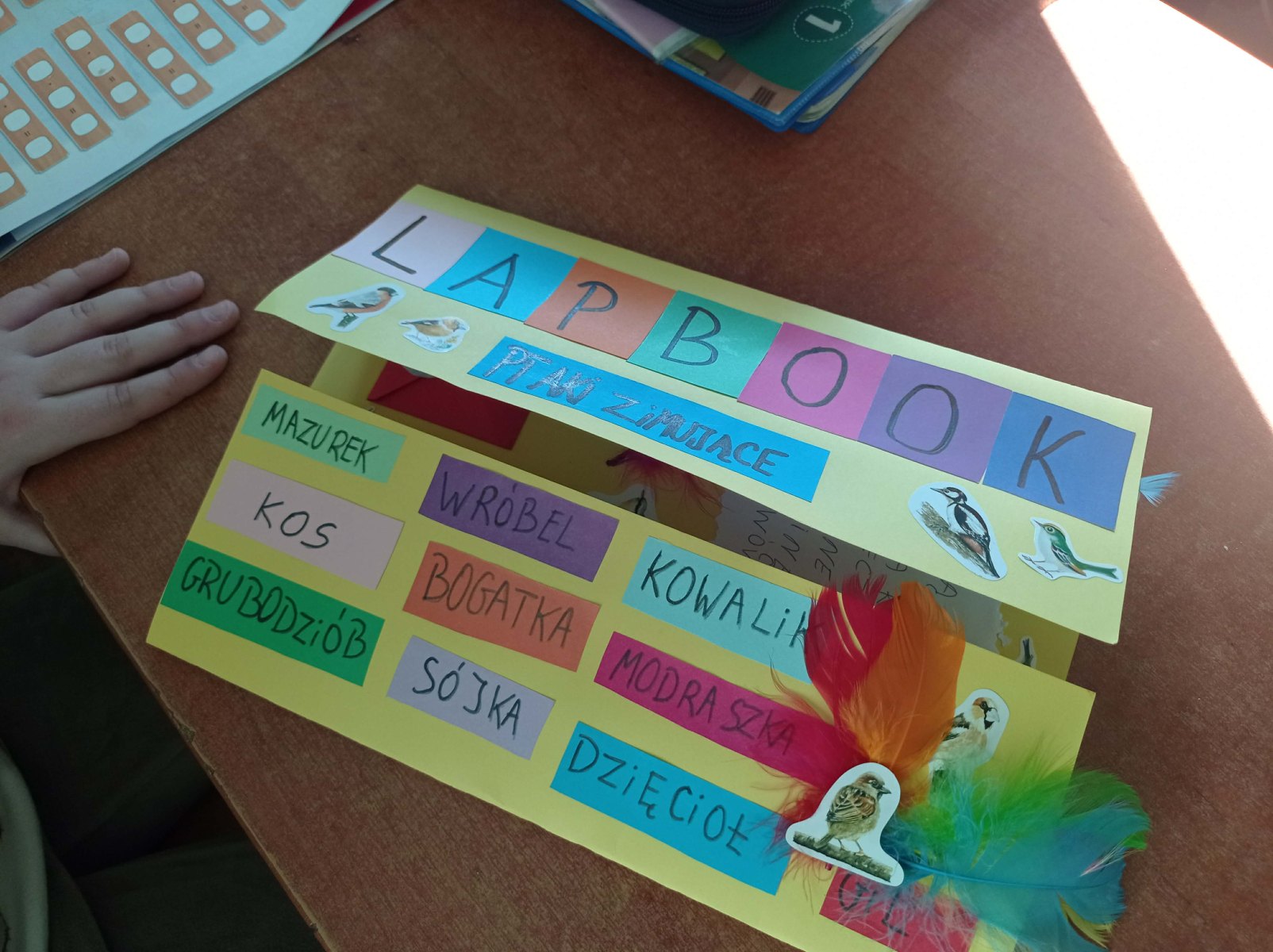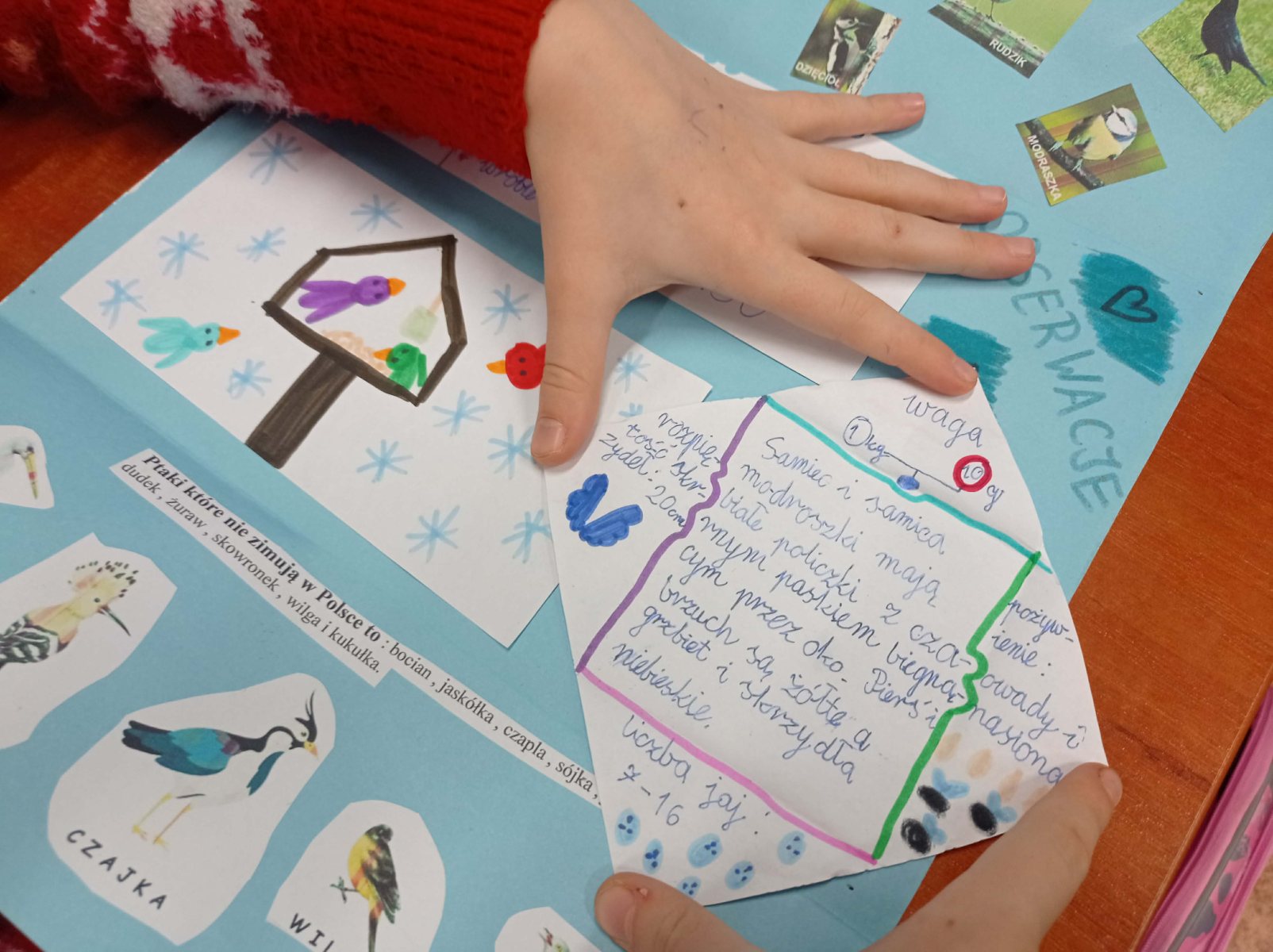 W ramach omawianego bloku tematycznego „Ptaki zimą”, uczniowie klasy 2b stworzyli lapbooki. Celem tego zadania było nie tylko zapoznanie się z ptakami zimującymi w Polsce, ale także utrwalenie zdobytej wiedzy w kreatywny sposób. Uczniowie zapoznali się z różnymi gatunkami zimującymi u nas ptaków, ich zwyczajami, sposobami przetrwania trudów mroźnej pory roku oraz ich rolą w ekosystemie. Uczestnicy zajęć przygotowali zdjęcia ptaków, napisali krótkie notatki na ich temat, wyszukiwali informacje w atlasach ptaków. Dzięki tej formie wspólnych działań nie tylko zapamiętali, które ptaki zostają w Polsce na zimę, ale również zdobyli informacje dotyczące ich charakterystyki, nawyków oraz warunków życia. Tworzenie lapbooka okazało się bardzo efektywną metodą pracy: uczniowie nie tylko zdobyli i utrwalili swoją wiedzę, ale również rozwinęli umiejętności kreatywne oraz manualne. Za oknem ustawiliśmy karmnik i zadbaliśmy o to, aby nie zabrakło w nim smakowitych ziarenek. Teraz będziemy mieli możliwość obserwowania ptaków przylatujących do „ptasiej stołówki”.