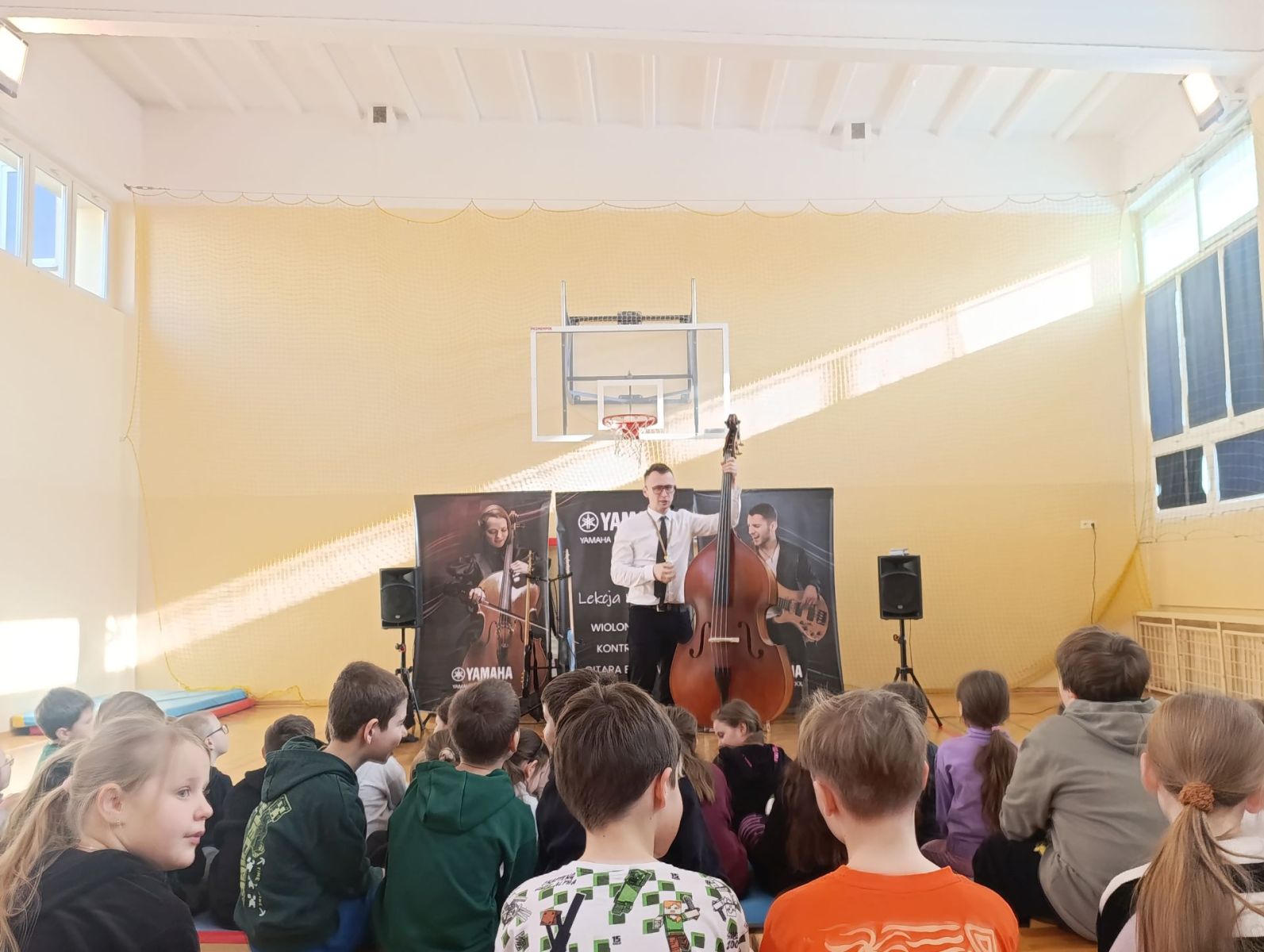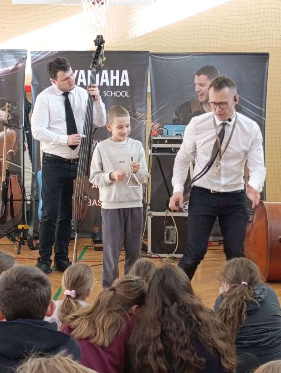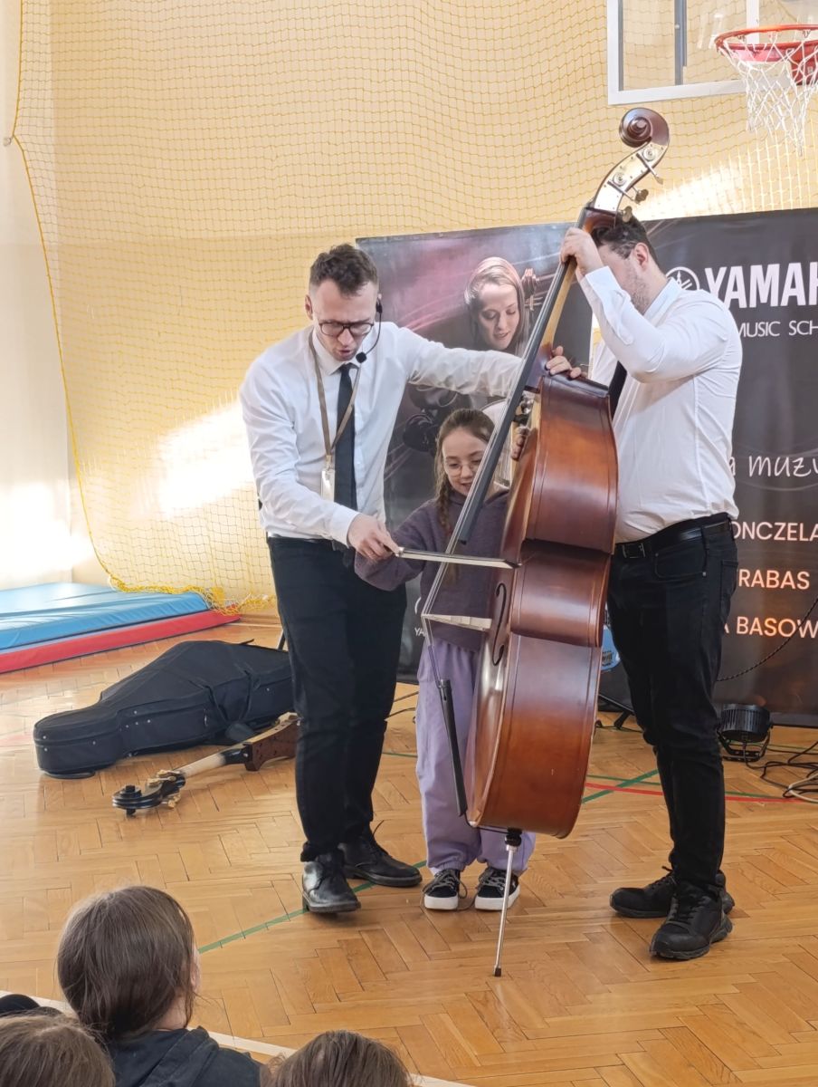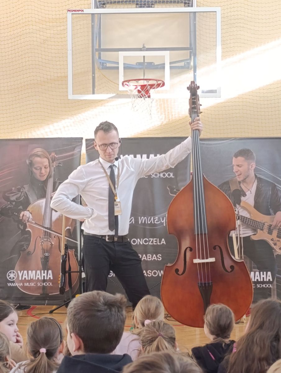 Dziś uczniowie klas 1–3 wzięli udział w zajęciach muzycznych prowadzonych przez szkołę muzyczną Yamaha. Tematem spotkania były instrumenty nisko brzmiące – m.in. kontrabas, gitary elektryczne, wiolonczela oraz głosy tenorowe i basowe.