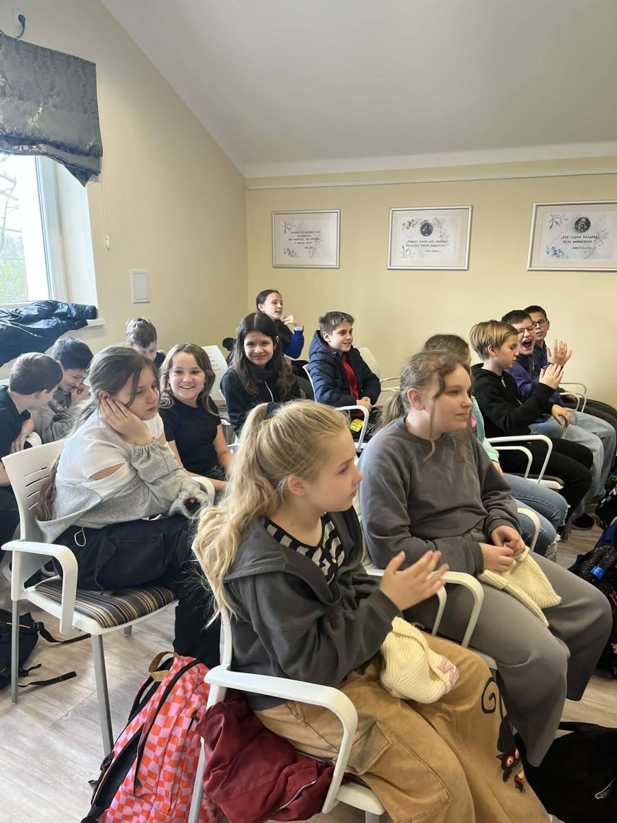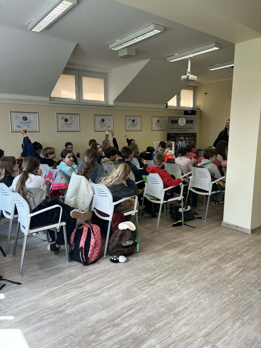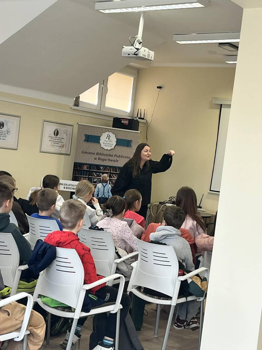 Spotkanie z p. Eweliną Jarnutowską – opowiadaczką i edukatorką – było niezwykłym wydarzeniem, które odbyło się 10.04.2026 r. w Bibliotece Publicznej w Boguchwale. Uczniowie klas czwartych wzięli udział w warsztatach czytelniczych, podczas których przenieśli się w świat pełen wyobraźni, emocji i ważnych wartości. Pani Ewelina w barwny i angażujący sposób snuła opowieści, które od pierwszych chwil przyciągały uwagę młodych słuchaczy.