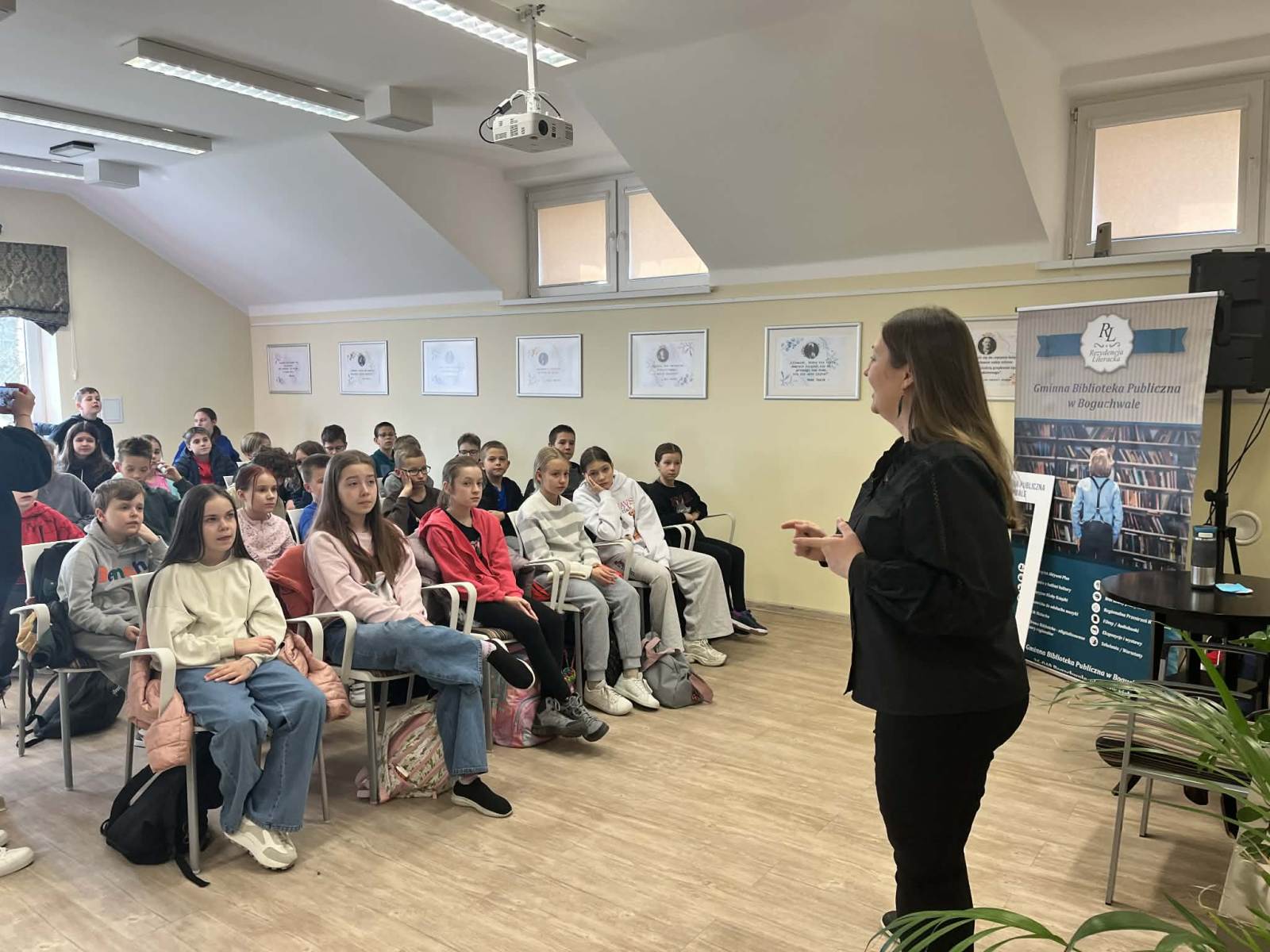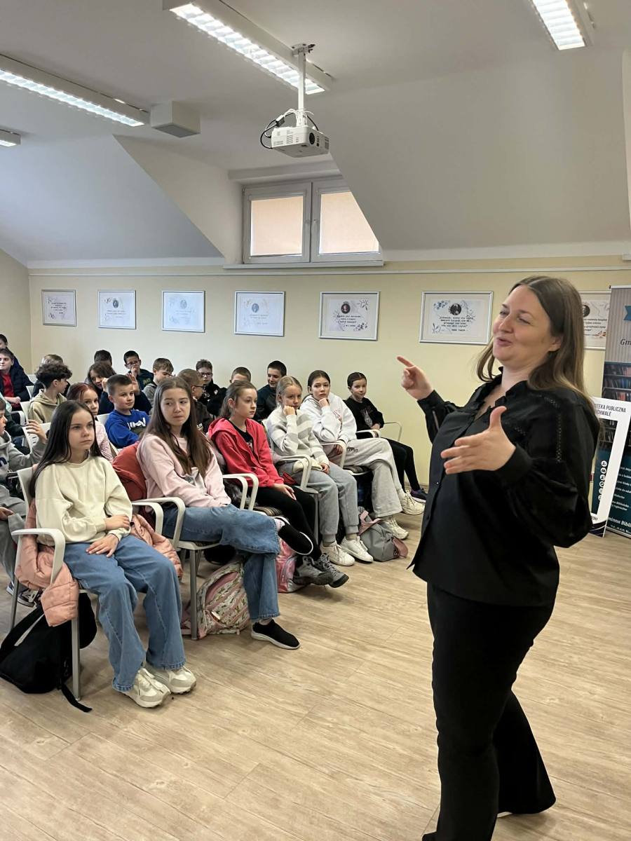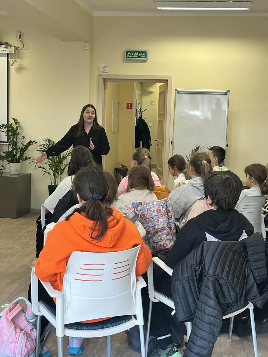 Spotkanie z p. Eweliną Jarnutowską – opowiadaczką i edukatorką – było niezwykłym wydarzeniem, które odbyło się 10.04.2026 r. w Bibliotece Publicznej w Boguchwale. Uczniowie klas czwartych wzięli udział w warsztatach czytelniczych, podczas których przenieśli się w świat pełen wyobraźni, emocji i ważnych wartości. Pani Ewelina w barwny i angażujący sposób snuła opowieści, które od pierwszych chwil przyciągały uwagę młodych słuchaczy.