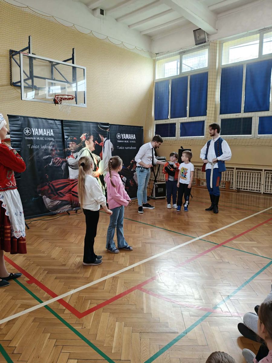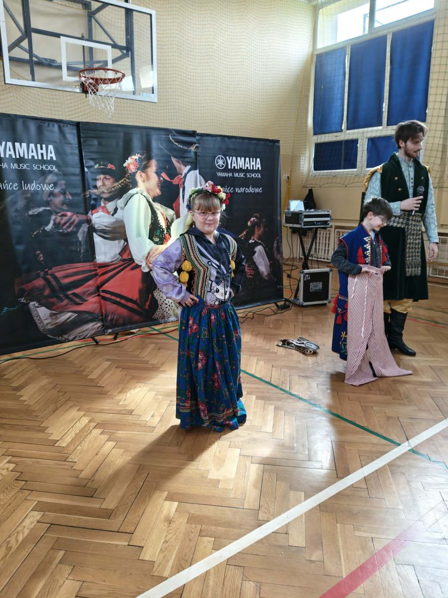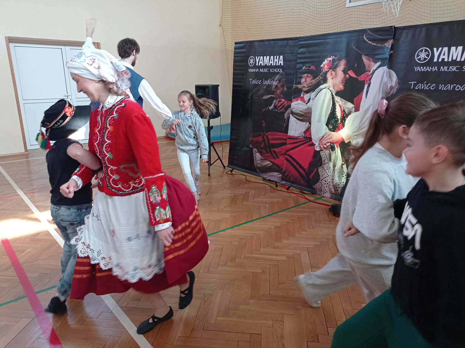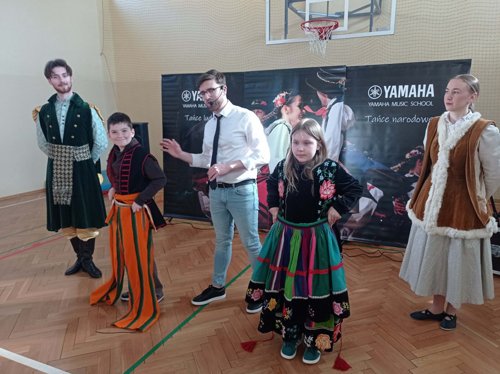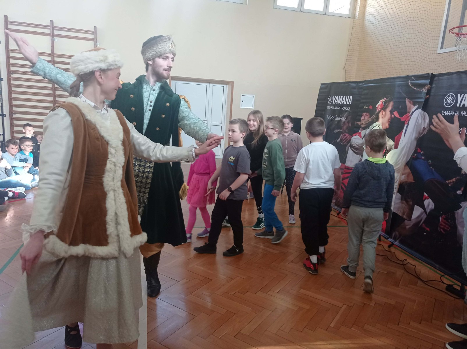 13 kwietnia 2026 r. w naszej szkole odbyły się wyjątkowe zajęcia prowadzone przez Szkołę Muzyczną Yamaha, poświęcone polskim tańcom ludowym oraz tradycyjnym strojom regionalnym. Uczniowie mieli okazję nie tylko wysłuchać ciekawych informacji, ale również aktywnie uczestniczyć w spotkaniu, poznając rytm i charakter takich tańców jak dostojny polonez, żywiołowa polka oraz dynamiczny krakowiak. Dużym zainteresowaniem cieszyła się prezentacja stroju rzeszowskiego, którego barwność, zdobienia i charakterystyczne elementy pozwoliły lepiej zrozumieć bogactwo kultury naszego regionu. Zajęcia były pełne muzyki, ruchu i zaangażowania uczniów, dzięki czemu stały się żywą lekcją tradycji, która na długo pozostanie w pamięci uczestników.