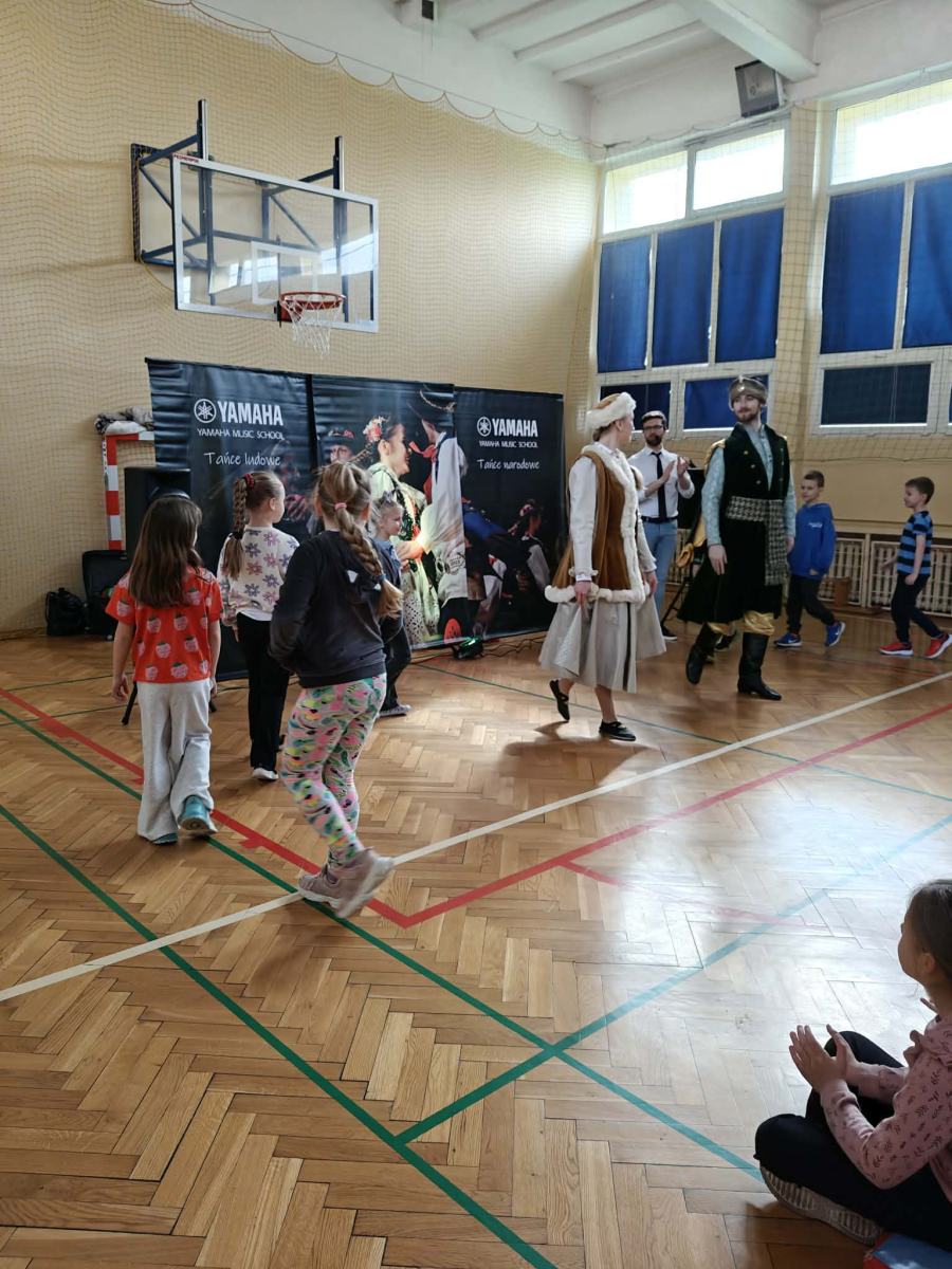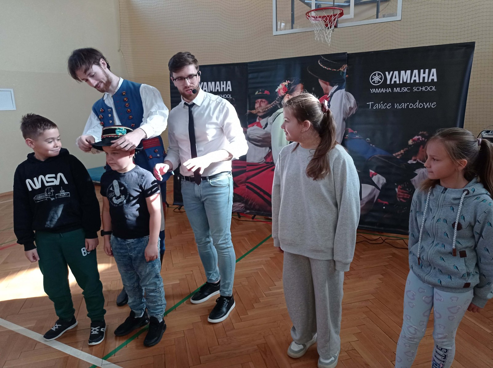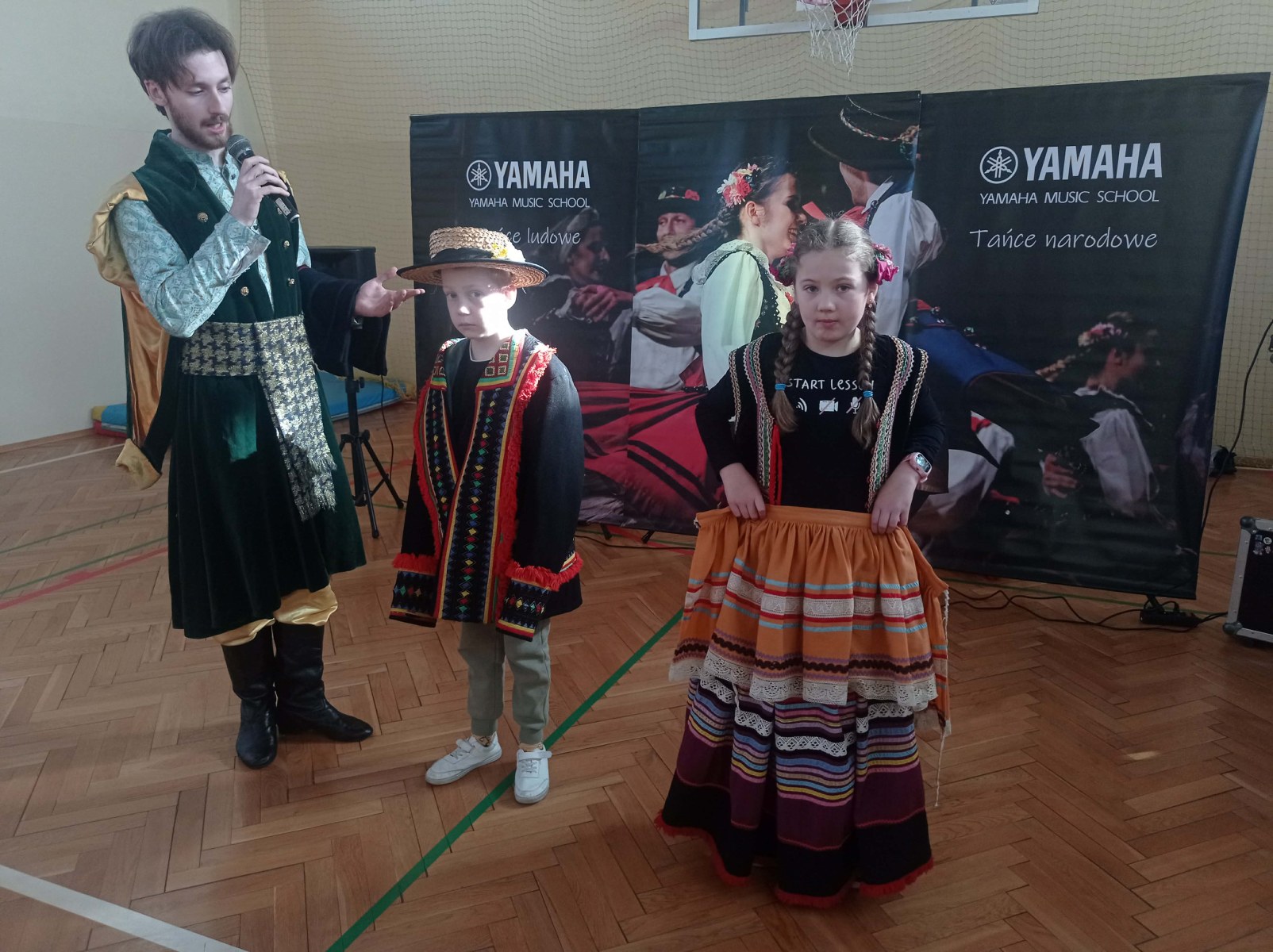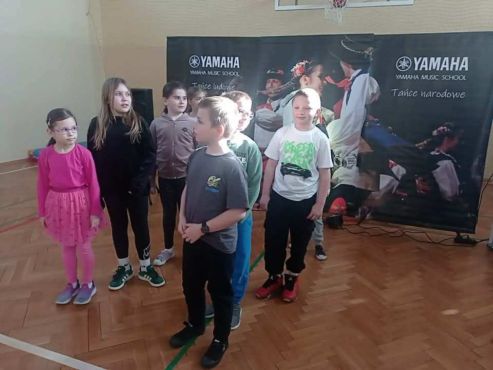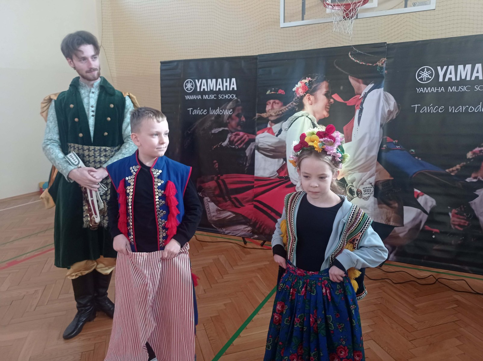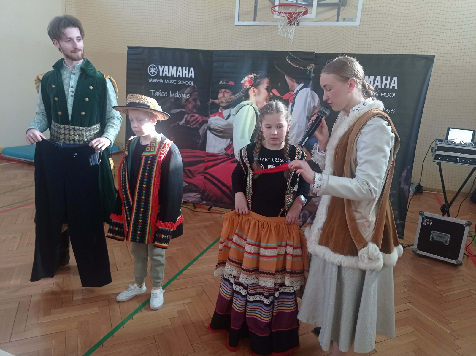13 kwietnia 2026 r. w naszej szkole odbyły się wyjątkowe zajęcia prowadzone przez Szkołę Muzyczną Yamaha, poświęcone polskim tańcom ludowym oraz tradycyjnym strojom regionalnym. Uczniowie mieli okazję nie tylko wysłuchać ciekawych informacji, ale również aktywnie uczestniczyć w spotkaniu, poznając rytm i charakter takich tańców jak dostojny polonez, żywiołowa polka oraz dynamiczny krakowiak. Dużym zainteresowaniem cieszyła się prezentacja stroju rzeszowskiego, którego barwność, zdobienia i charakterystyczne elementy pozwoliły lepiej zrozumieć bogactwo kultury naszego regionu. Zajęcia były pełne muzyki, ruchu i zaangażowania uczniów, dzięki czemu stały się żywą lekcją tradycji, która na długo pozostanie w pamięci uczestników.