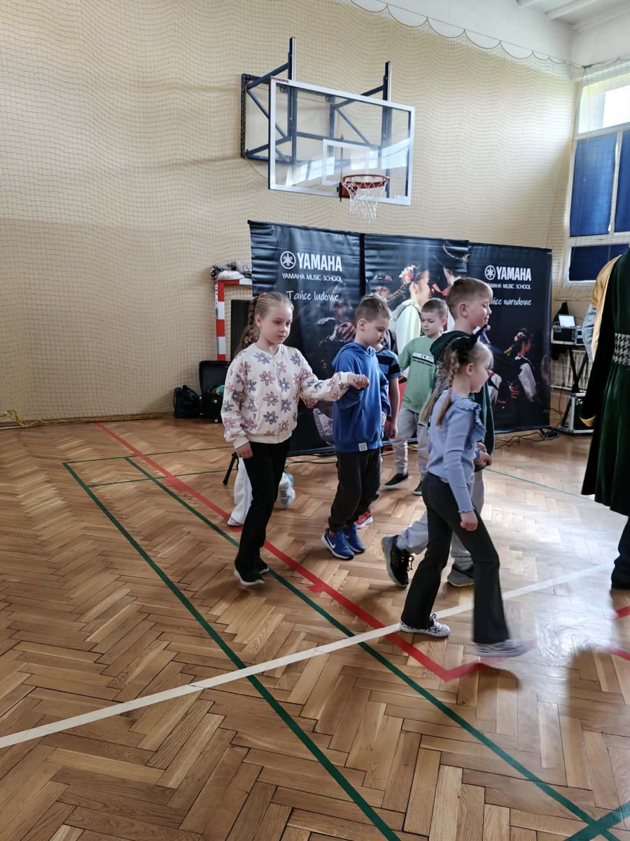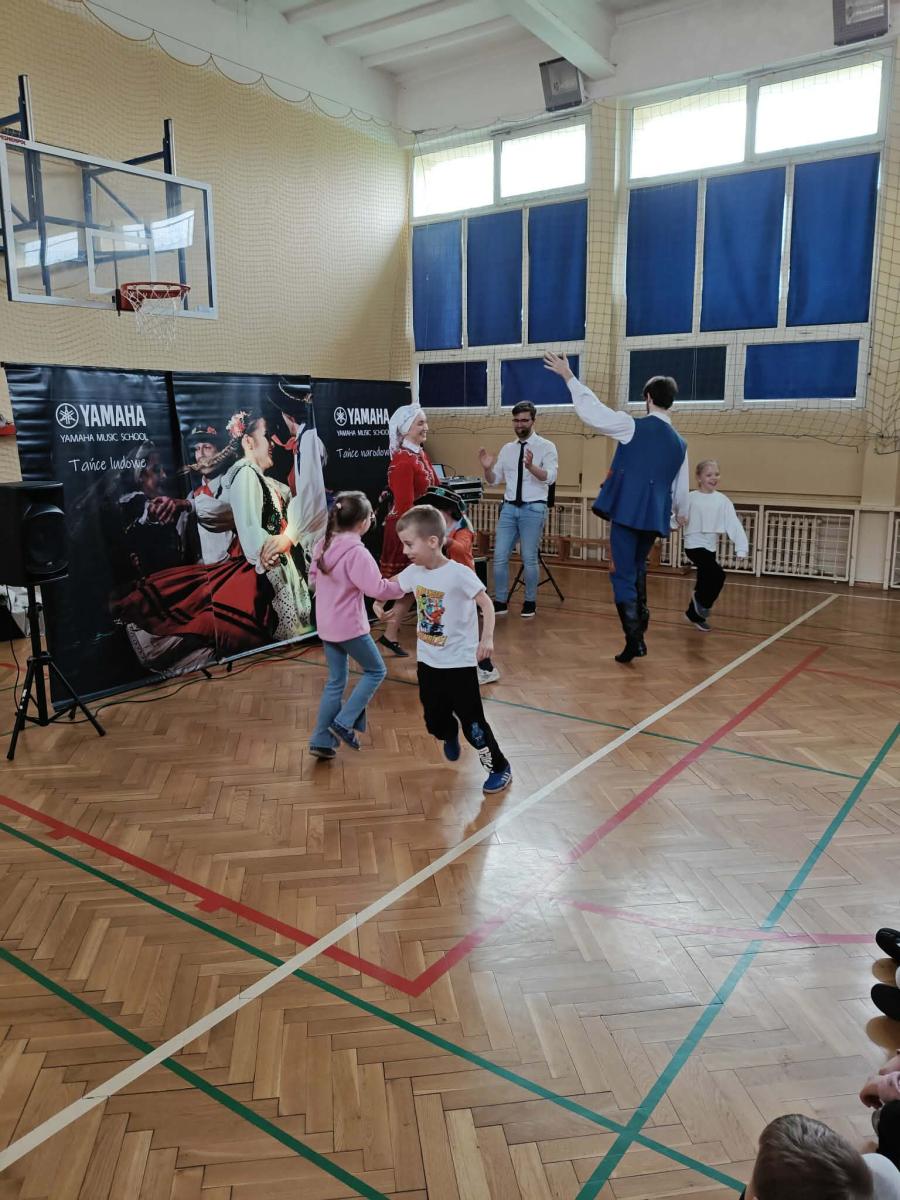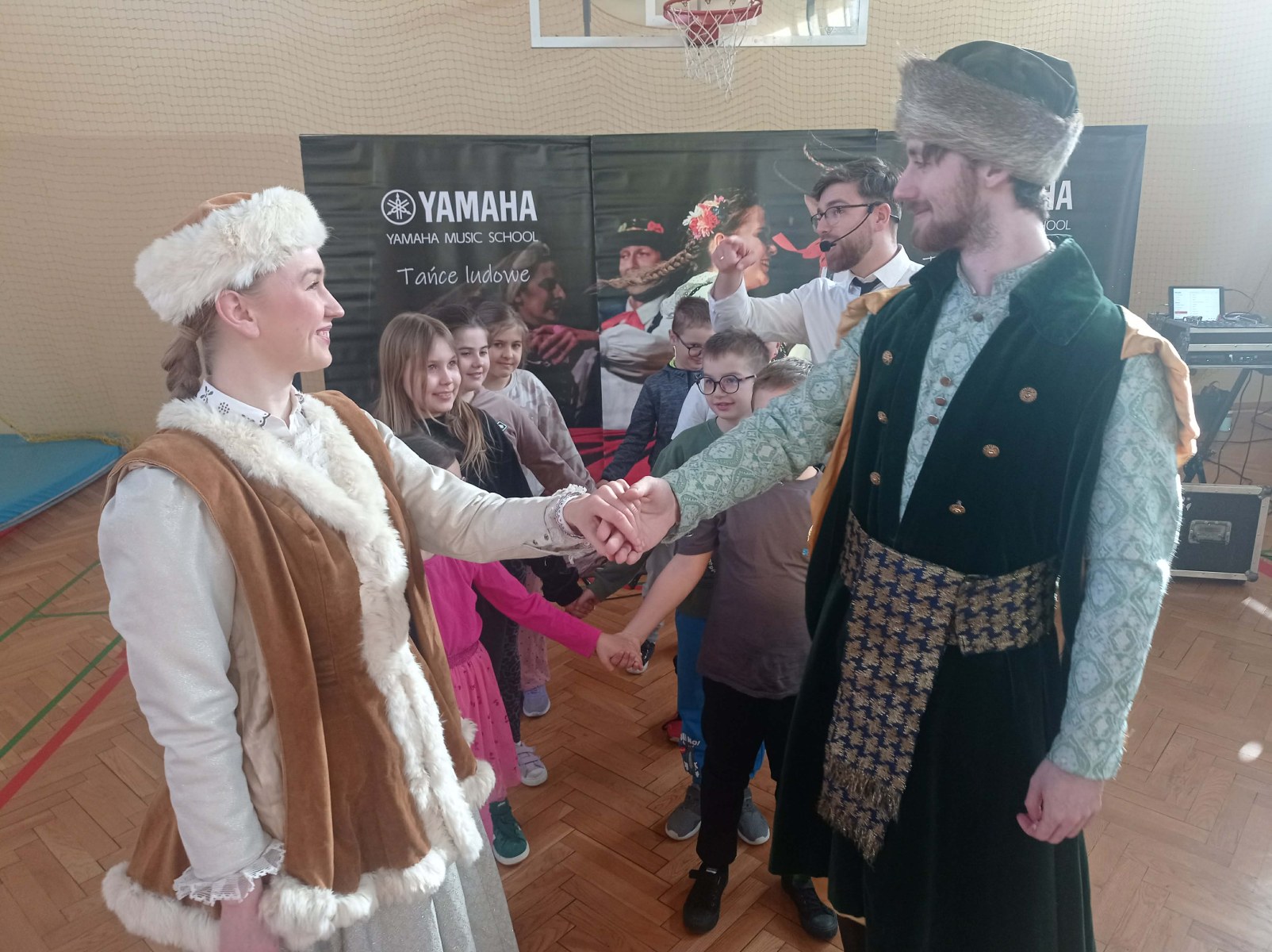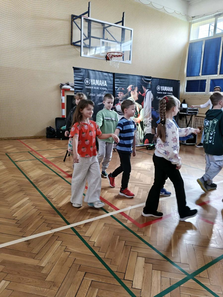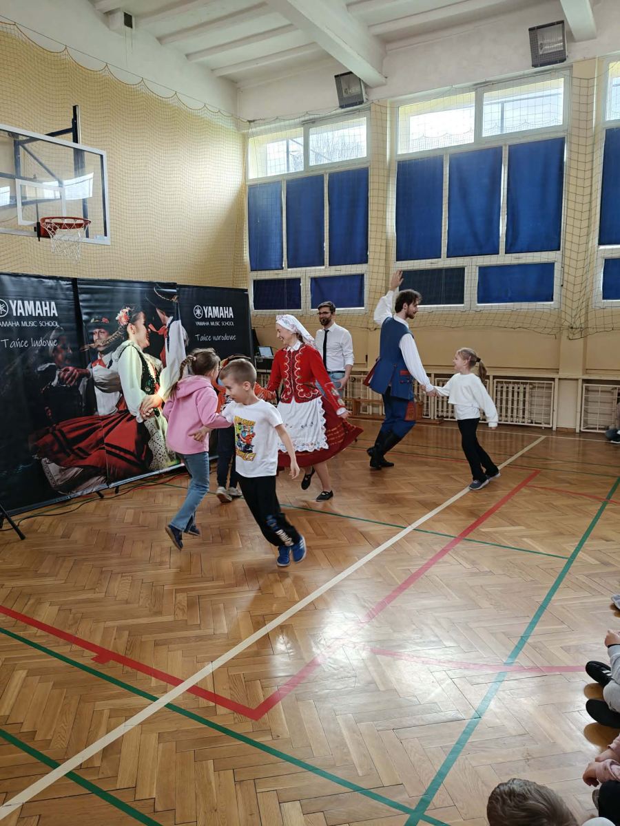 13 kwietnia 2026 r. w naszej szkole odbyły się wyjątkowe zajęcia prowadzone przez Szkołę Muzyczną Yamaha, poświęcone polskim tańcom ludowym oraz tradycyjnym strojom regionalnym. Uczniowie mieli okazję nie tylko wysłuchać ciekawych informacji, ale również aktywnie uczestniczyć w spotkaniu, poznając rytm i charakter takich tańców jak dostojny polonez, żywiołowa polka oraz dynamiczny krakowiak. Dużym zainteresowaniem cieszyła się prezentacja stroju rzeszowskiego, którego barwność, zdobienia i charakterystyczne elementy pozwoliły lepiej zrozumieć bogactwo kultury naszego regionu. Zajęcia były pełne muzyki, ruchu i zaangażowania uczniów, dzięki czemu stały się żywą lekcją tradycji, która na długo pozostanie w pamięci uczestników.