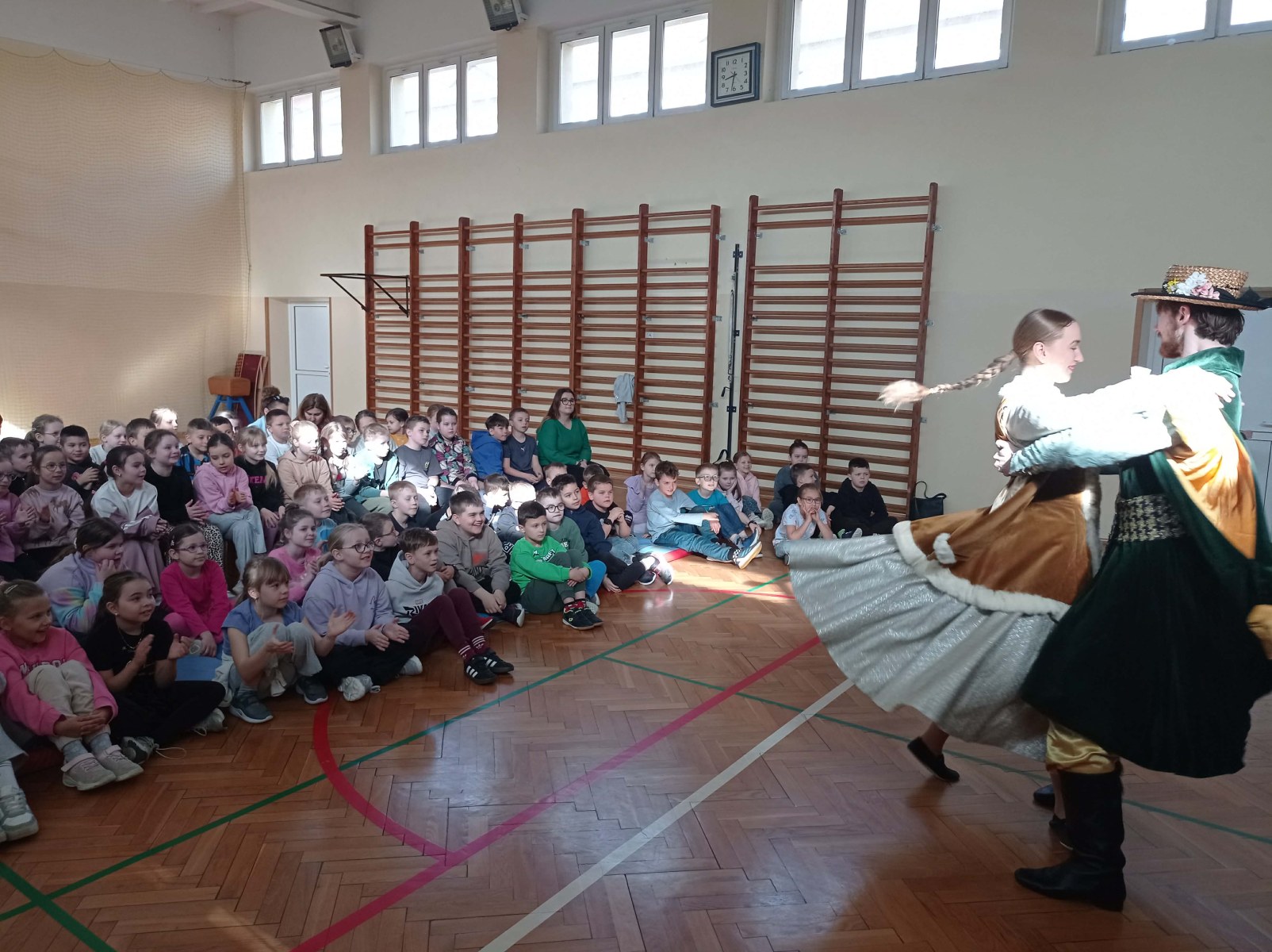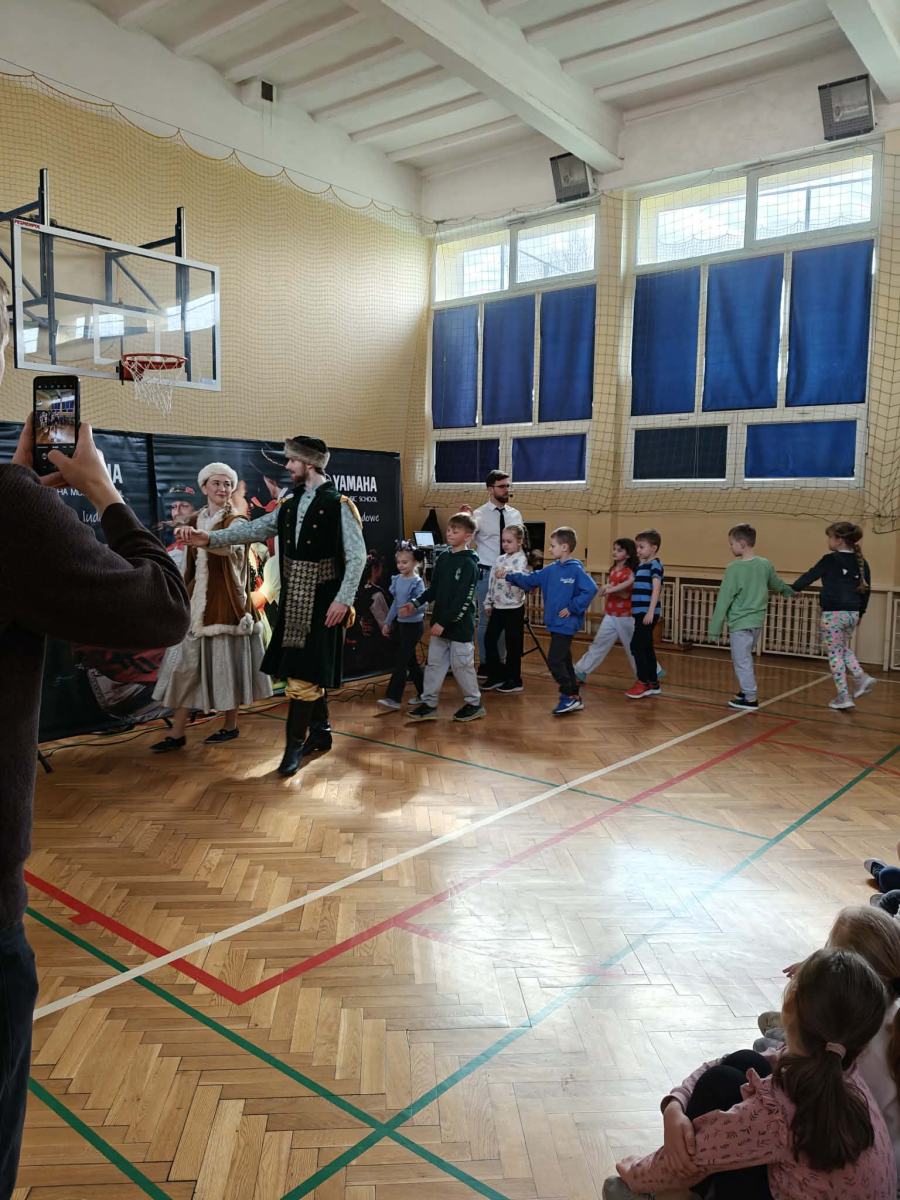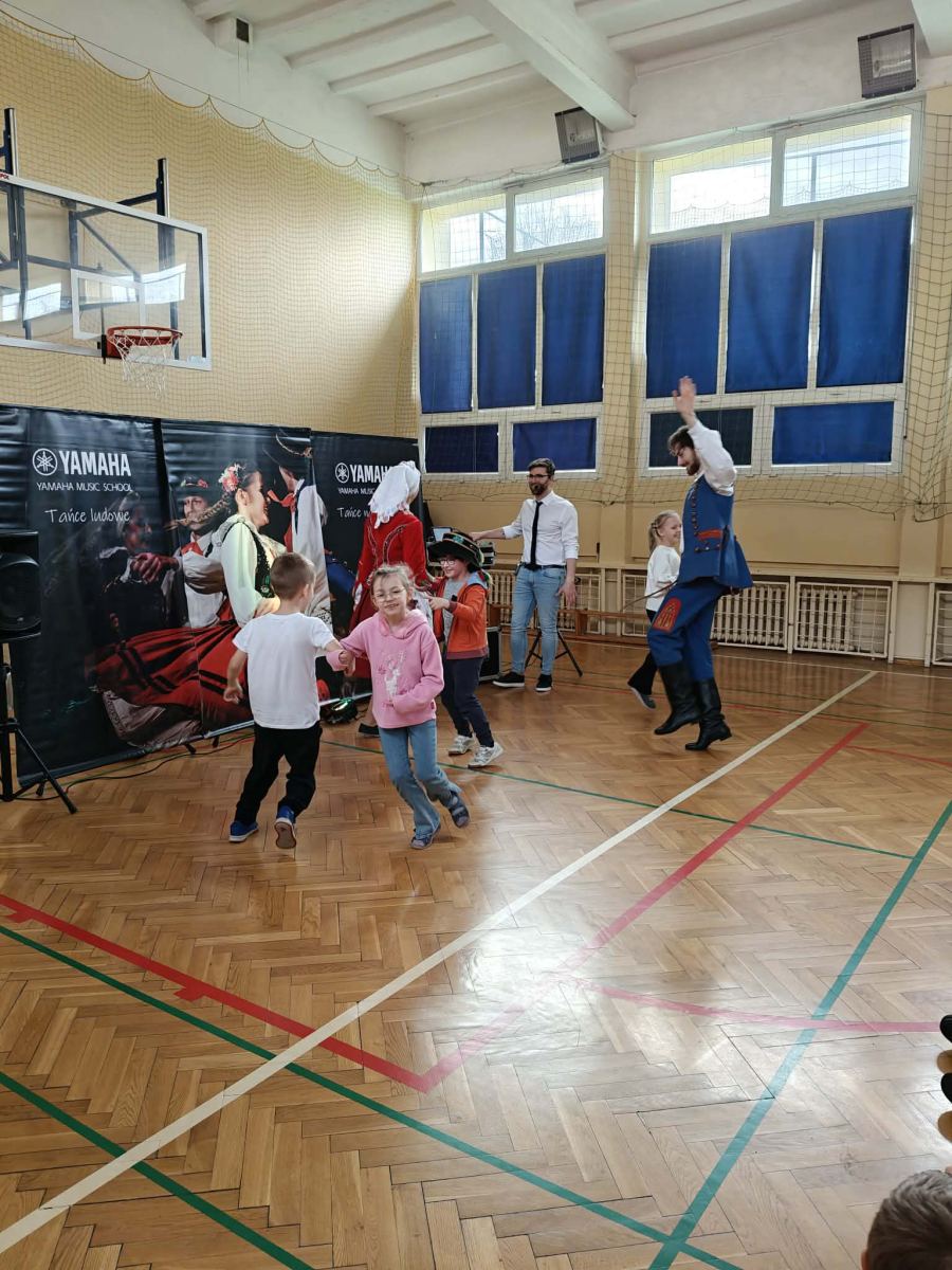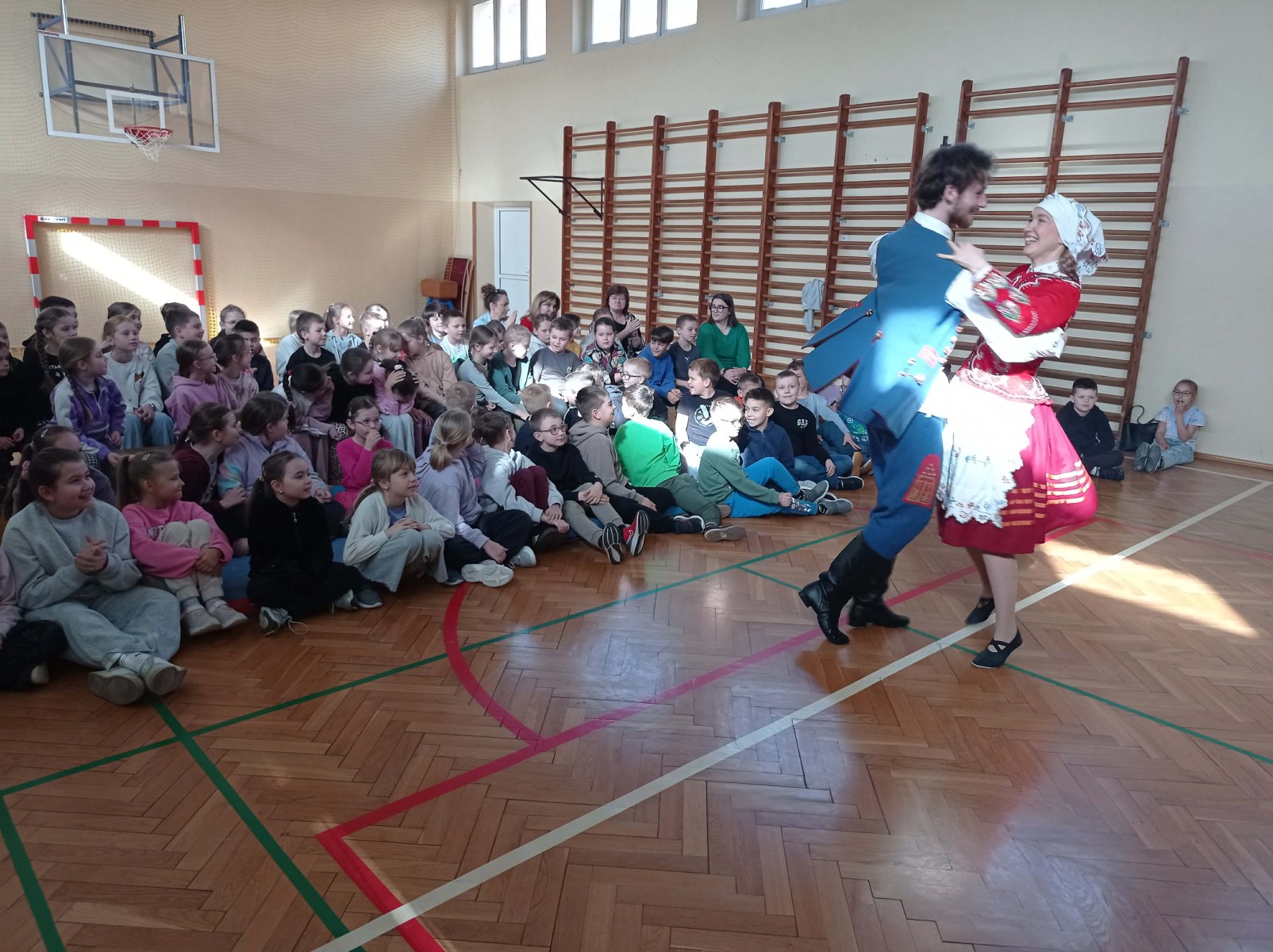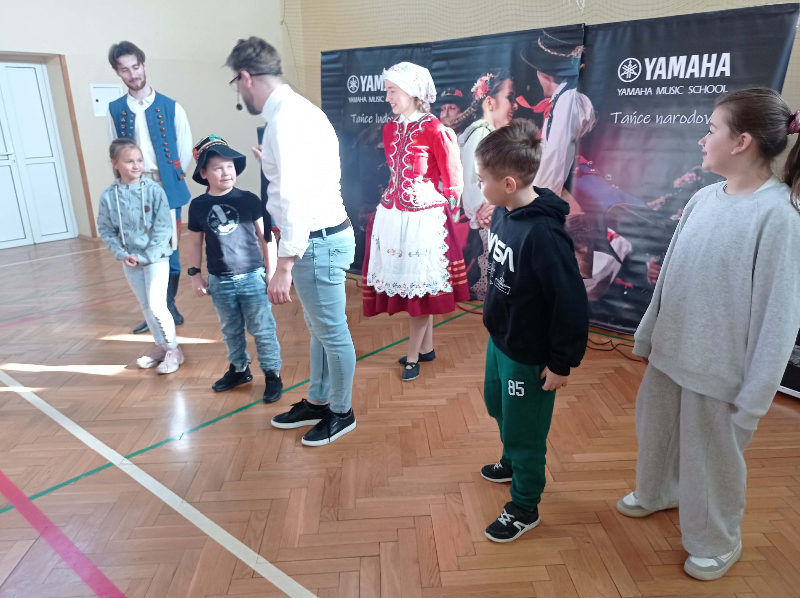 13 kwietnia 2026 r. w naszej szkole odbyły się wyjątkowe zajęcia prowadzone przez Szkołę Muzyczną Yamaha, poświęcone polskim tańcom ludowym oraz tradycyjnym strojom regionalnym. Uczniowie mieli okazję nie tylko wysłuchać ciekawych informacji, ale również aktywnie uczestniczyć w spotkaniu, poznając rytm i charakter takich tańców jak dostojny polonez, żywiołowa polka oraz dynamiczny krakowiak. Dużym zainteresowaniem cieszyła się prezentacja stroju rzeszowskiego, którego barwność, zdobienia i charakterystyczne elementy pozwoliły lepiej zrozumieć bogactwo kultury naszego regionu. Zajęcia były pełne muzyki, ruchu i zaangażowania uczniów, dzięki czemu stały się żywą lekcją tradycji, która na długo pozostanie w pamięci uczestników.