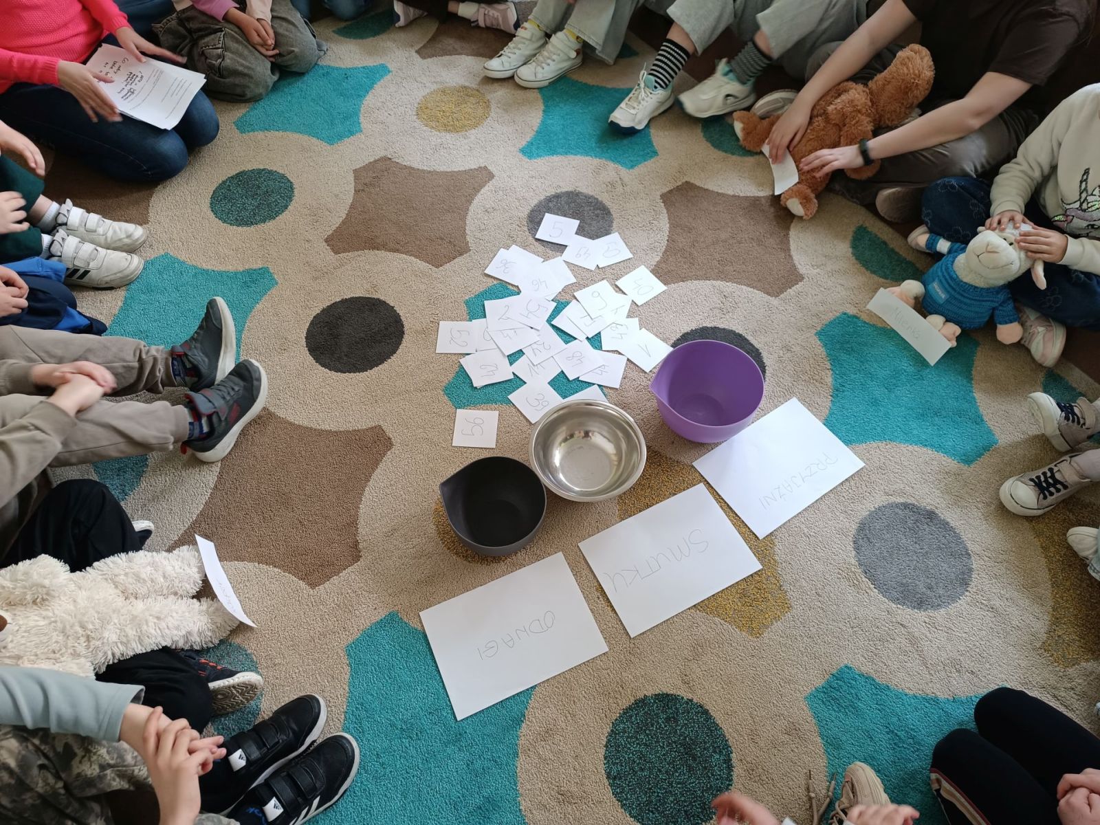 Podczas zajęć wykorzystano trzy miski oznaczone hasłami: smutek, odwaga i przyjaźń. Zadaniem uczniów było dopasowanie karteczek z różnymi sytuacjami i stwierdzeniami do odpowiednich emocji. Dzięki temu dzieci mogły lepiej zrozumieć, kiedy i dlaczego odczuwamy dane emocje oraz jak sobie z nimi radzić.