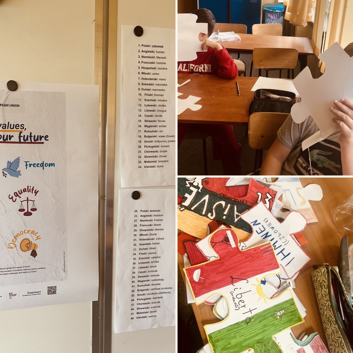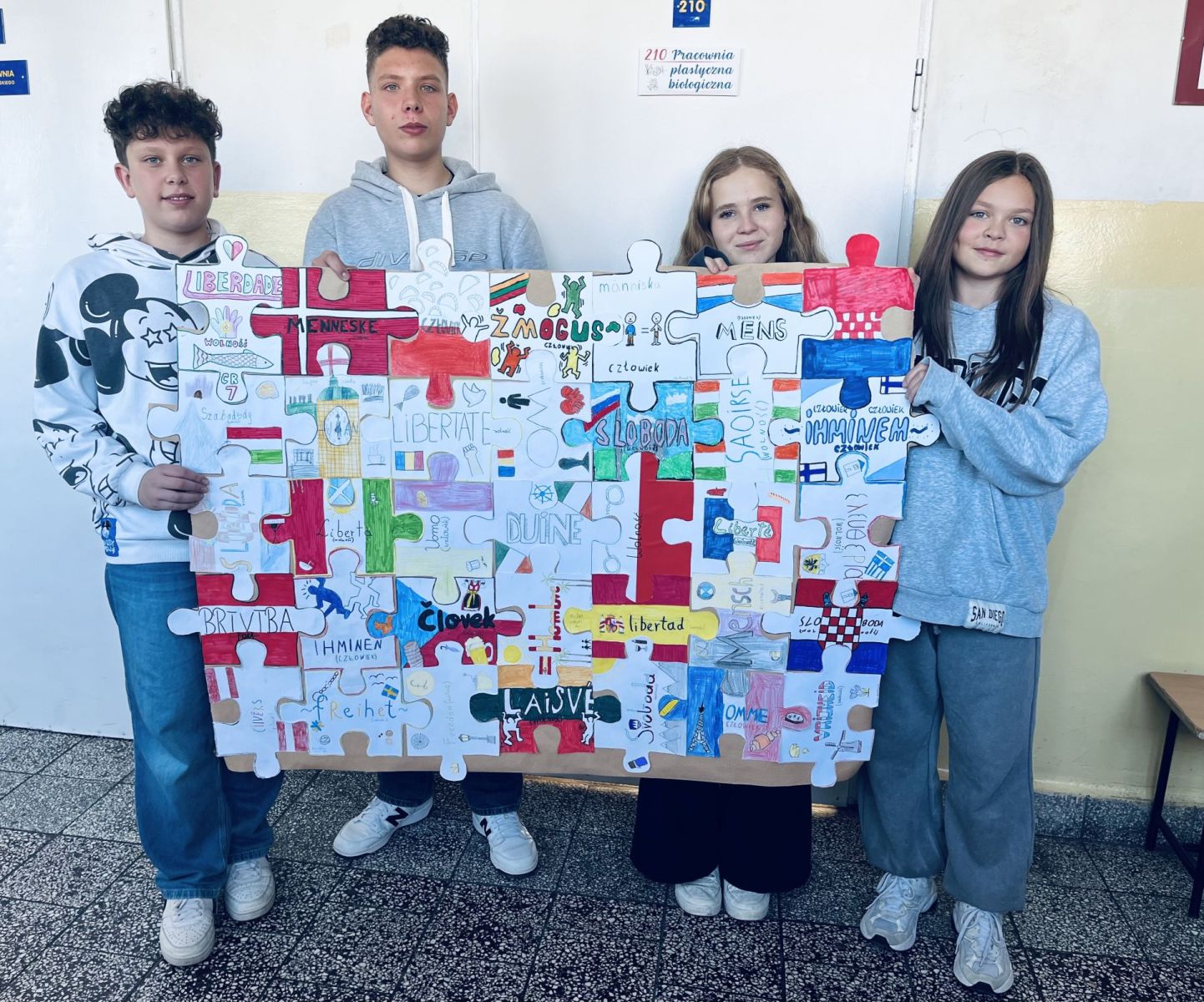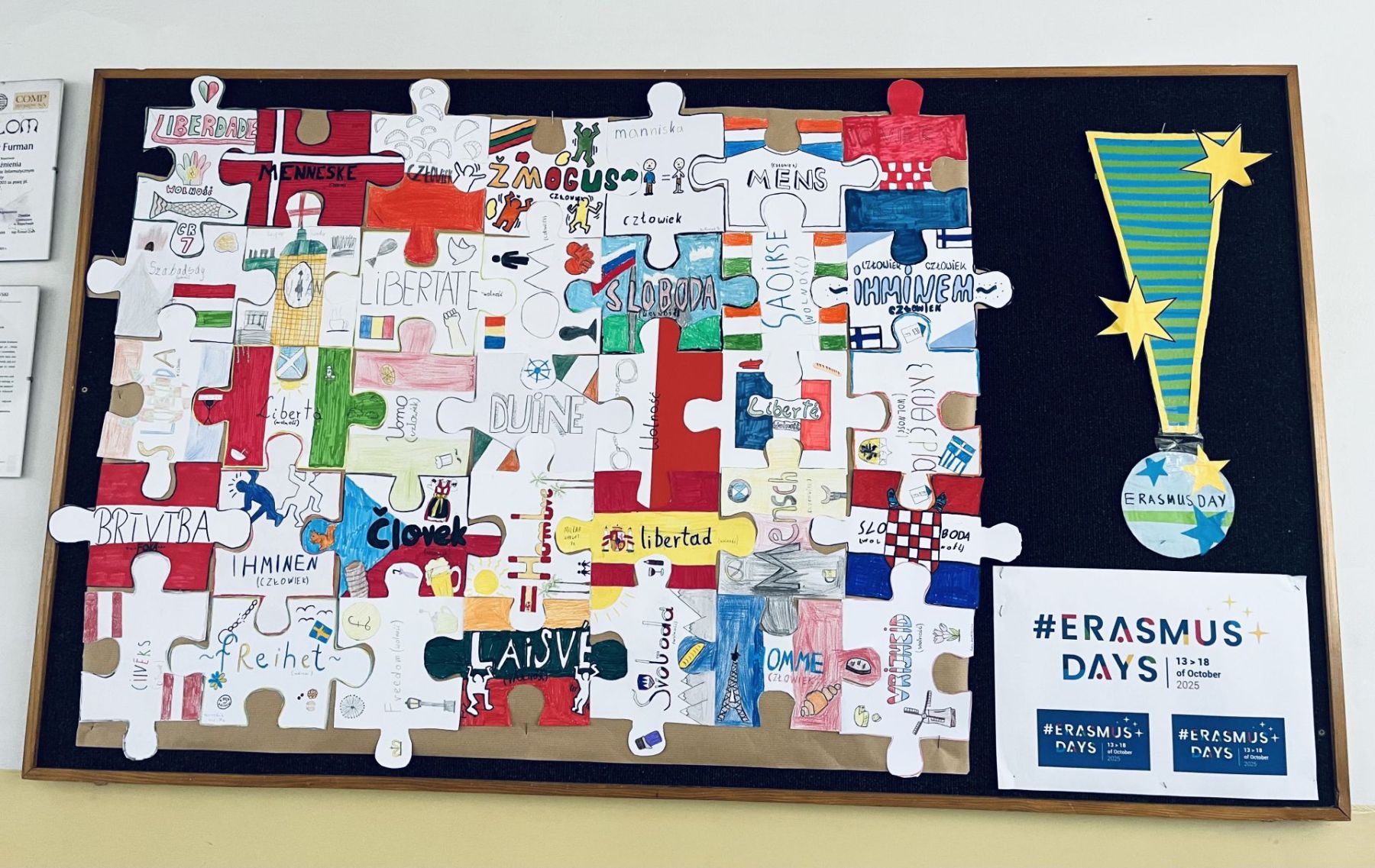 #ErasmusDays to międzynarodowe, sześciodniowe święto programu Erasmus+ obchodzone co roku w dniach 13-18 października. Również my jako szkoła realizująca Akredytację Erasmus+ włączyliśmy się po raz kolejny w to wydarzenie. Tym razem uczniowie kl. VII na lekcji plastyki wykonali pod kierunkiem p. Anny Chruściel wspólny projekt polegający na stworzeniu puzzli XL. Puzzle odnosiły się do motywu przewodniego tegorocznej edycji, którymi były wartości UE; poszanowanie godności ludzkiej, wolność, demokracja, równość, praworządność i prawa człowieka. Każdy mniejszy puzzel zawierał tłumaczenie słowa „człowiek” lub „wolność” na jeden z języków wybranego kraju UE. Pojedyncze puzzle zostały połączone w całość tworząc plakat – dekorację. W taki symboliczny sposób pokazujemy, że każdy z nas jest częścią całości: zarówno każdy uczeń częścią grupy, a jednocześnie my jako szkoła częścią wspólnoty realizującej działania Erasmus+.