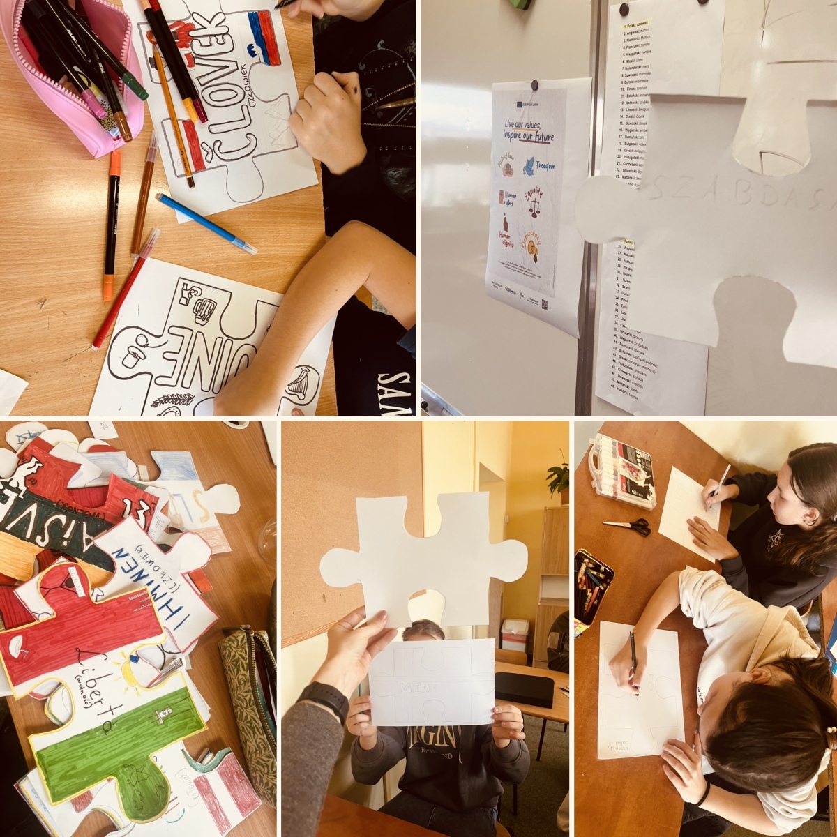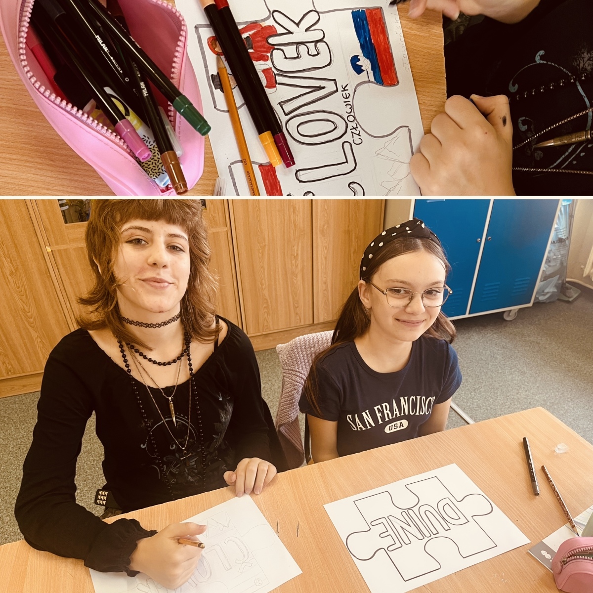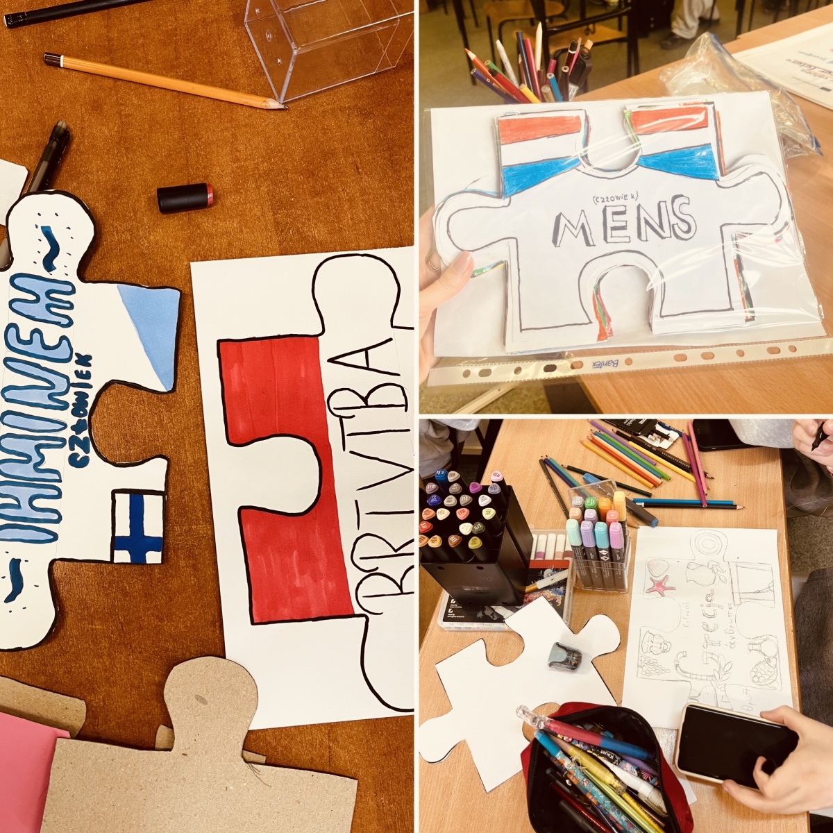 #ErasmusDays to międzynarodowe, sześciodniowe święto programu Erasmus+ obchodzone co roku w dniach 13-18 października. Również my jako szkoła realizująca Akredytację Erasmus+ włączyliśmy się po raz kolejny w to wydarzenie. Tym razem uczniowie kl. VII na lekcji plastyki wykonali pod kierunkiem p. Anny Chruściel wspólny projekt polegający na stworzeniu puzzli XL. Puzzle odnosiły się do motywu przewodniego tegorocznej edycji, którymi były wartości UE; poszanowanie godności ludzkiej, wolność, demokracja, równość, praworządność i prawa człowieka. Każdy mniejszy puzzel zawierał tłumaczenie słowa „człowiek” lub „wolność” na jeden z języków wybranego kraju UE. Pojedyncze puzzle zostały połączone w całość tworząc plakat – dekorację. W taki symboliczny sposób pokazujemy, że każdy z nas jest częścią całości: zarówno każdy uczeń częścią grupy, a jednocześnie my jako szkoła częścią wspólnoty realizującej działania Erasmus+.