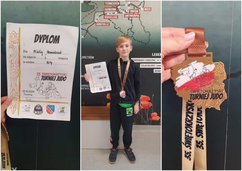 W dniu 25.10.25. odbył się 35 Świętokrzyski Turniej Judo w Hali Sportowej Liceum Sportowego we wsi Nowiny, zorganizowany przez klub UKS JUDO NOKO. Uczeń klasy 4c Mikołaj Marcinkowski trenujący w Fun Fight Judo zajął 1 miejsce w kategorii waga 30 kg. Serdecznie gratulujemy!!