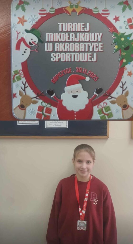 Miło nam poinformować, że uczennica naszej szkoły – Lena Dragan, zdobyła 2 miejsce podczas Turnieju Mikołajkowego w Akrobatyce Sportowej, który odbył się 30 listopada 2025 r. w Ropczycach. Turniej był okazją do zaprezentowania umiejętności młodych sportowców z całego regionu. Gratulujemy wspaniałego występu i pasji oraz życzymy dalszych sukcesów.