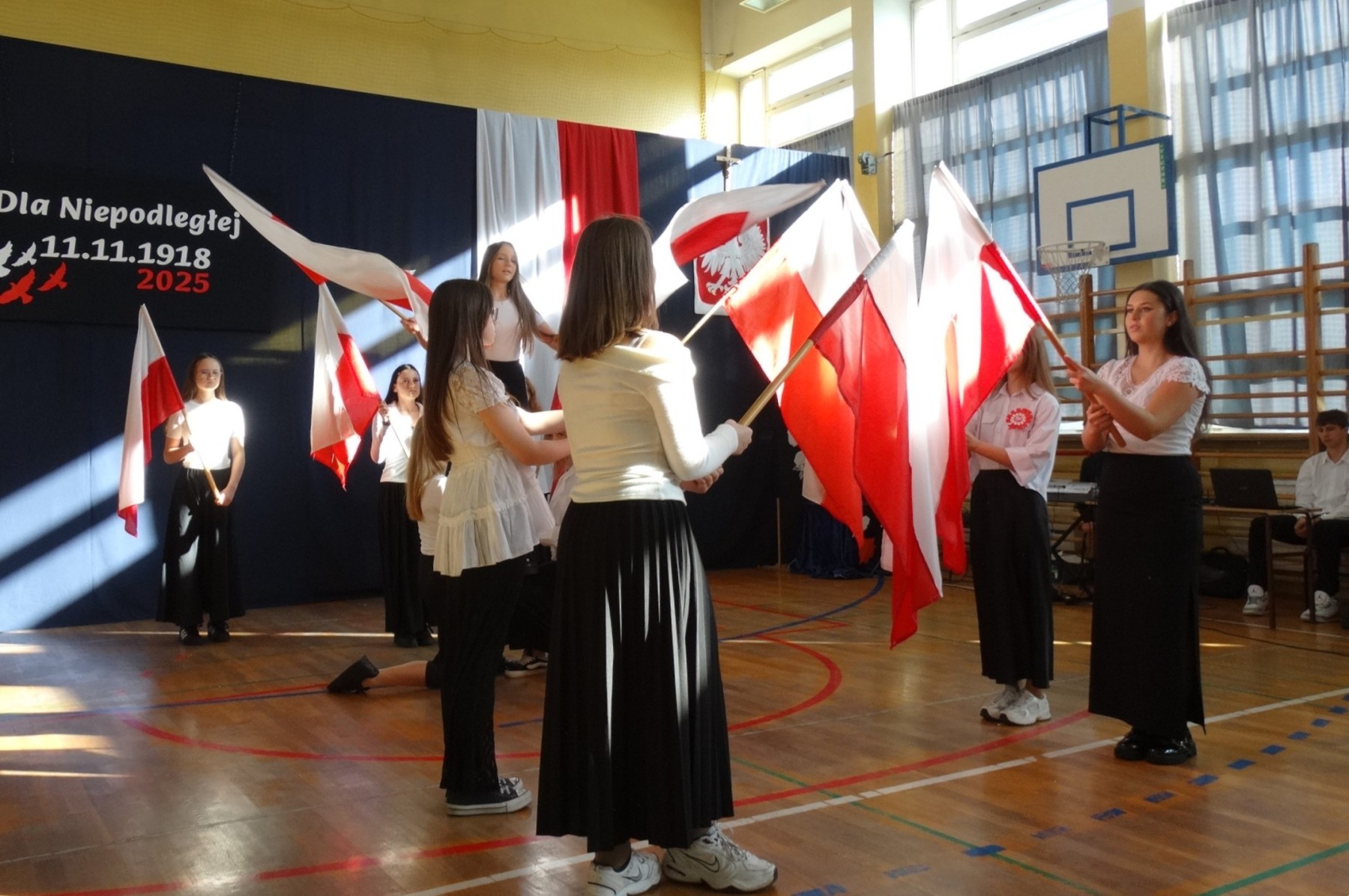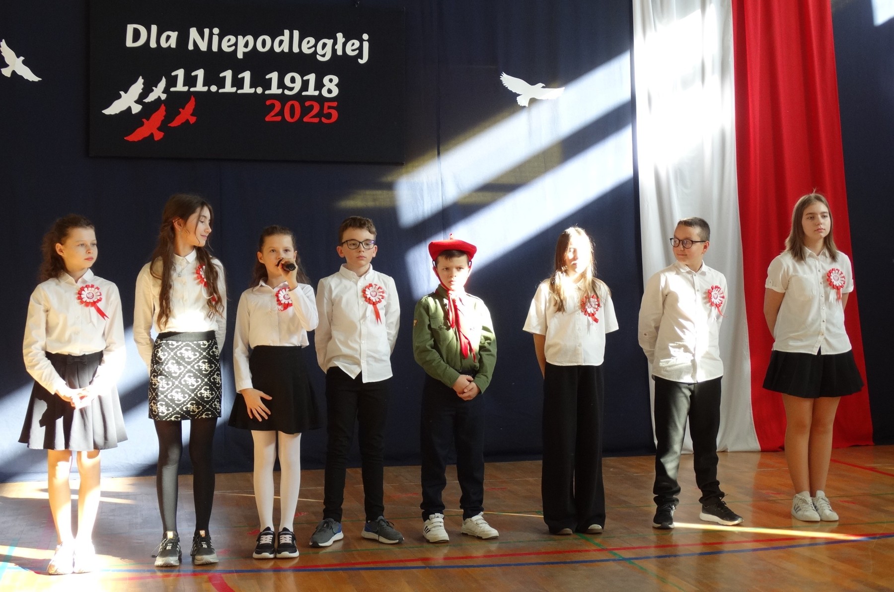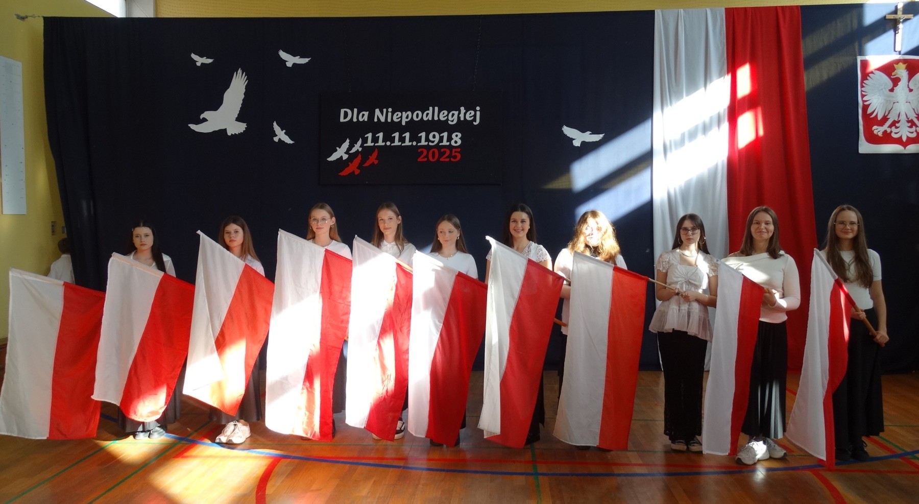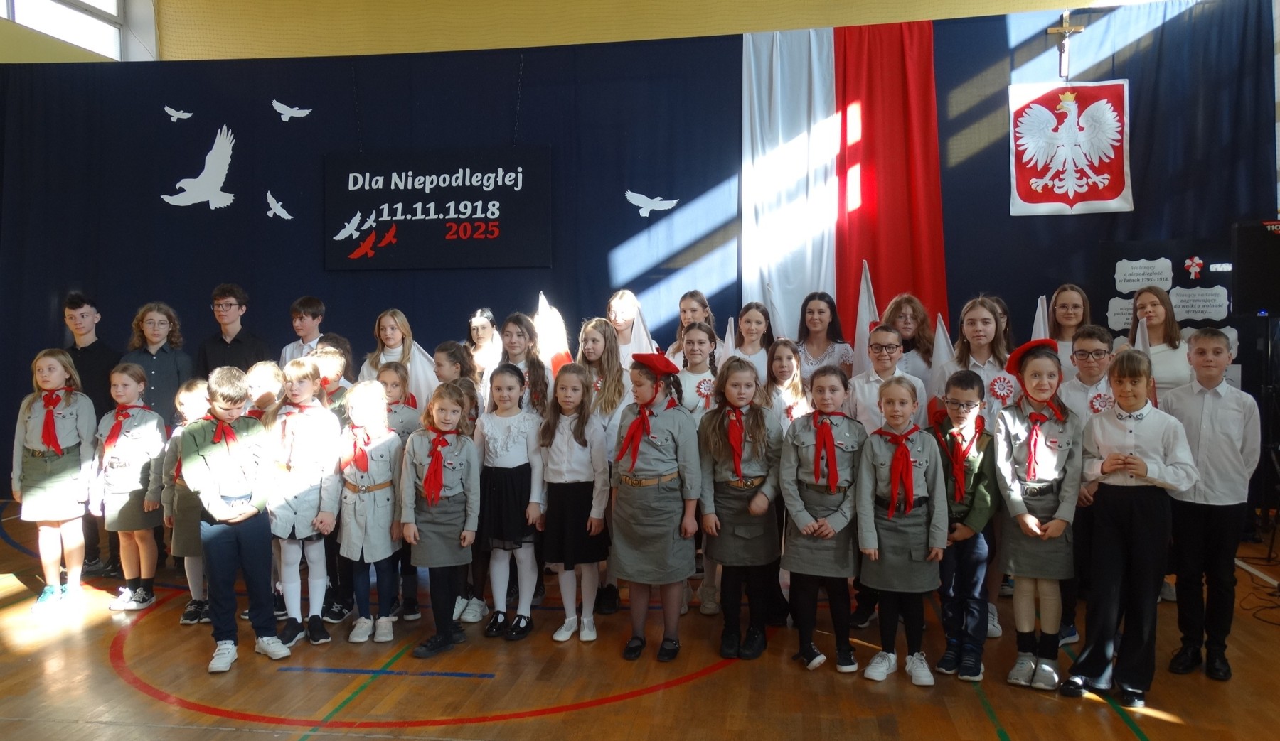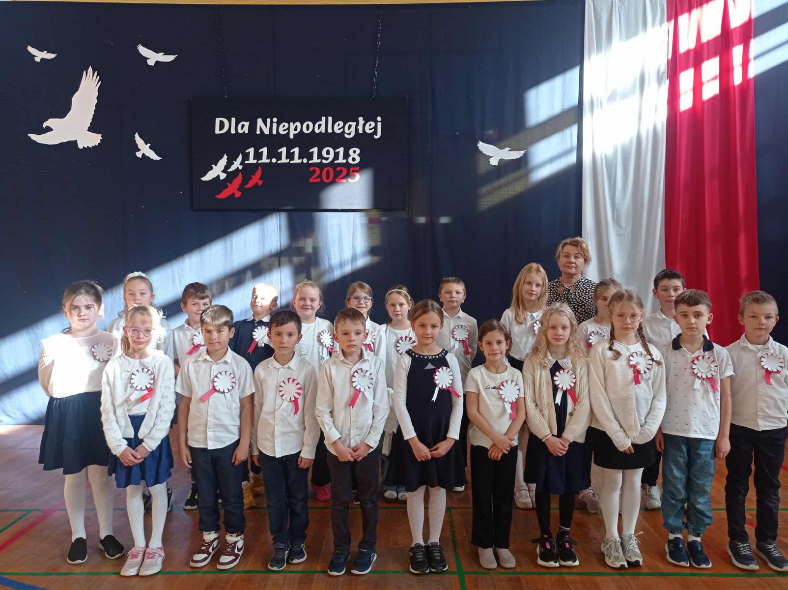 7 listopada 2025 r. r. w naszej szkole odbyła się uroczysta akademia z tej okazji. W swym wystąpieniu Dyrektor szkoły, mgr Artur Bilski przypomniał, że wolność raz zdobyta i niepodległość nie są dane na zawsze, lecz należy wciąż dbać o te wartości i stale je pielęgnować. Część artystyczna zawierała różnorodne formy artystyczne: recytacje, śpiew i taniec. Widowisko nawiązywało do historii, ale też zachęcało do refleksji nad tym, czym dziś jest wolność. Umożliwiało także zaangażowanie wielu uczniów. Akademię przygotowała p. Lidia Lesiak we współpracy z p. Izabellą Rejment (zuchy), p. Grzegorzem Ziobro (muzyka), p. Renatą Luderą (taniec z flagami) i p. Anną Chruściel (scenografia).