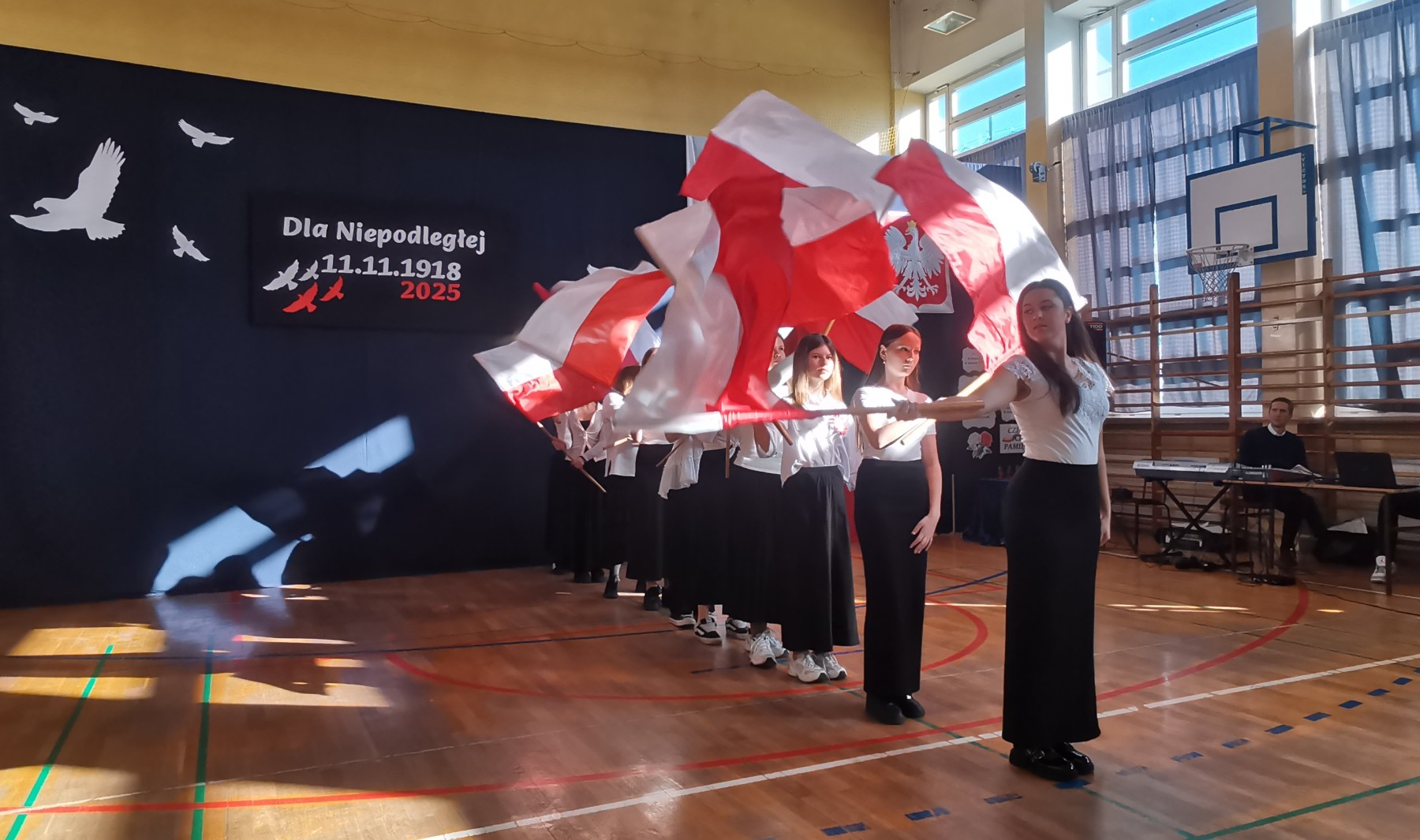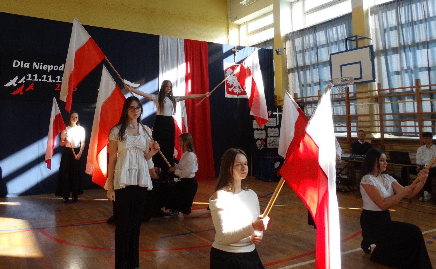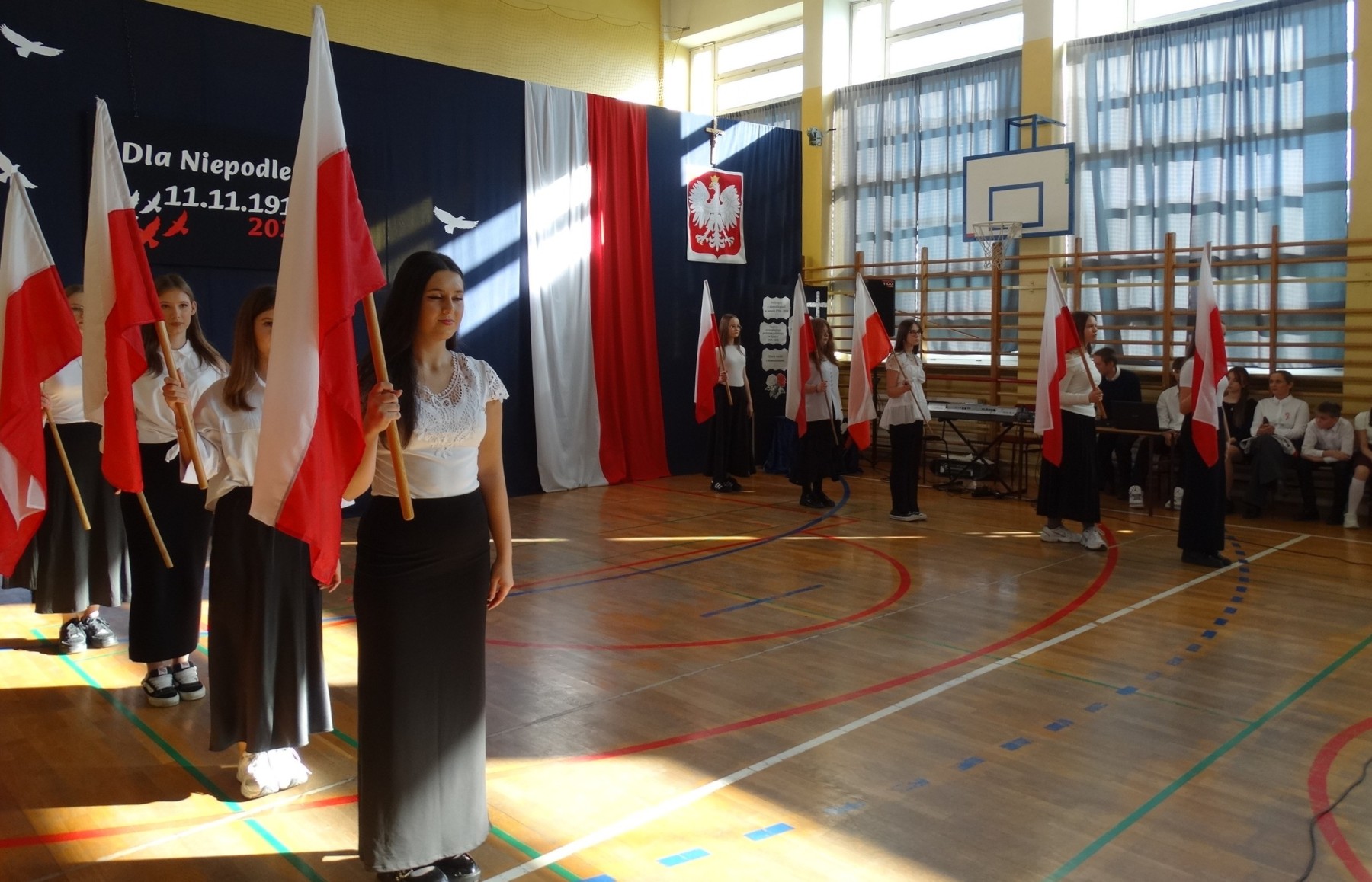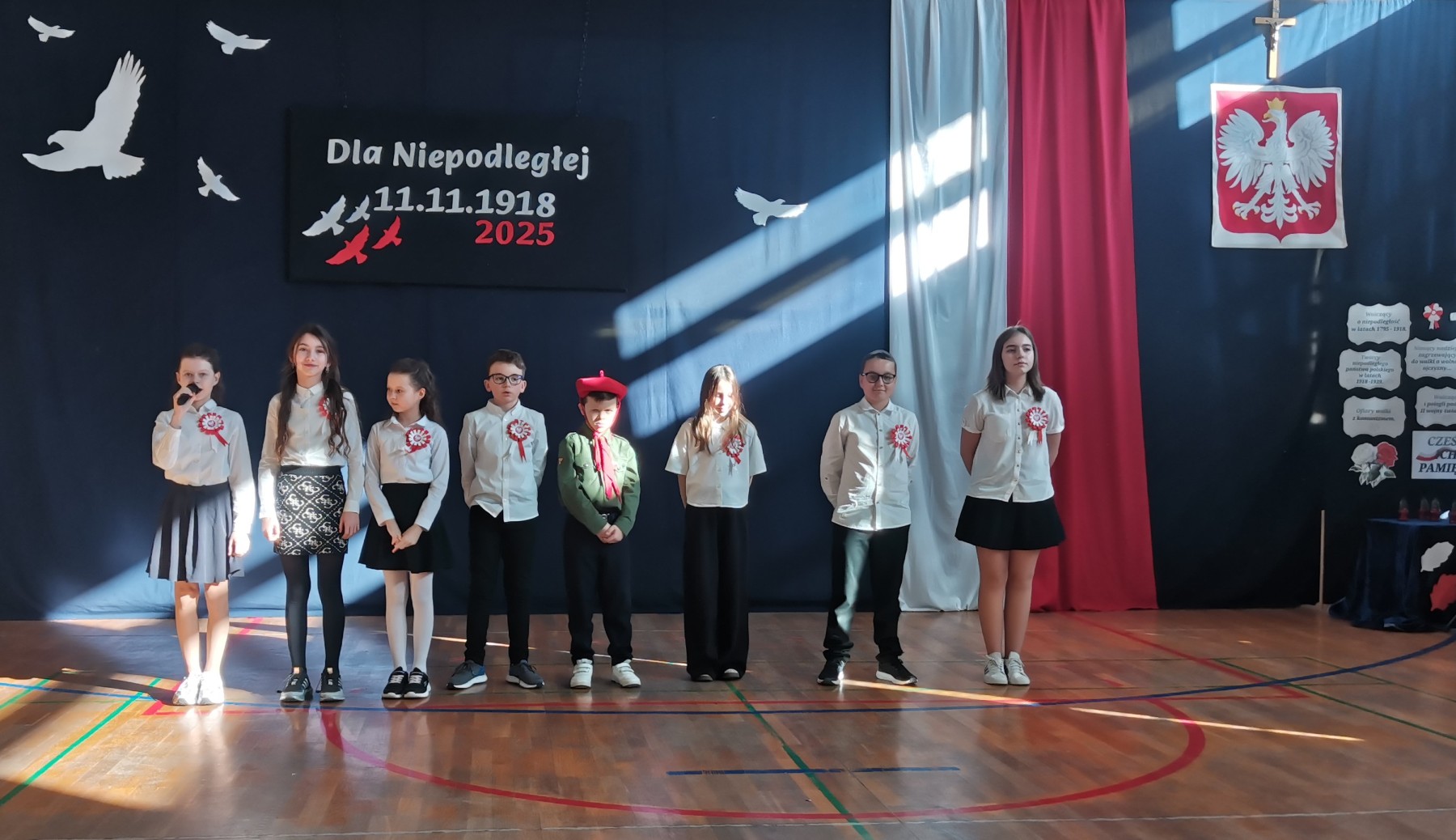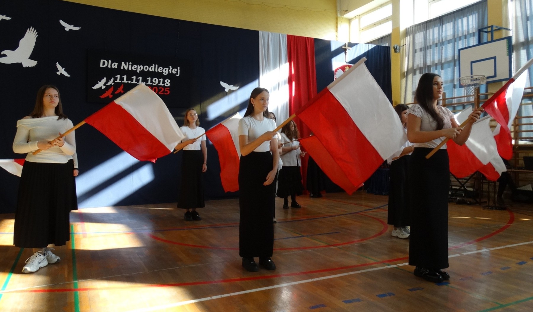 7 listopada 2025 r. r. w naszej szkole odbyła się uroczysta akademia z tej okazji. W swym wystąpieniu Dyrektor szkoły, mgr Artur Bilski przypomniał, że wolność raz zdobyta i niepodległość nie są dane na zawsze, lecz należy wciąż dbać o te wartości i stale je pielęgnować. Część artystyczna zawierała różnorodne formy artystyczne: recytacje, śpiew i taniec. Widowisko nawiązywało do historii, ale też zachęcało do refleksji nad tym, czym dziś jest wolność. Umożliwiało także zaangażowanie wielu uczniów. Akademię przygotowała p. Lidia Lesiak we współpracy z p. Izabellą Rejment (zuchy), p. Grzegorzem Ziobro (muzyka), p. Renatą Luderą (taniec z flagami) i p. Anną Chruściel (scenografia).