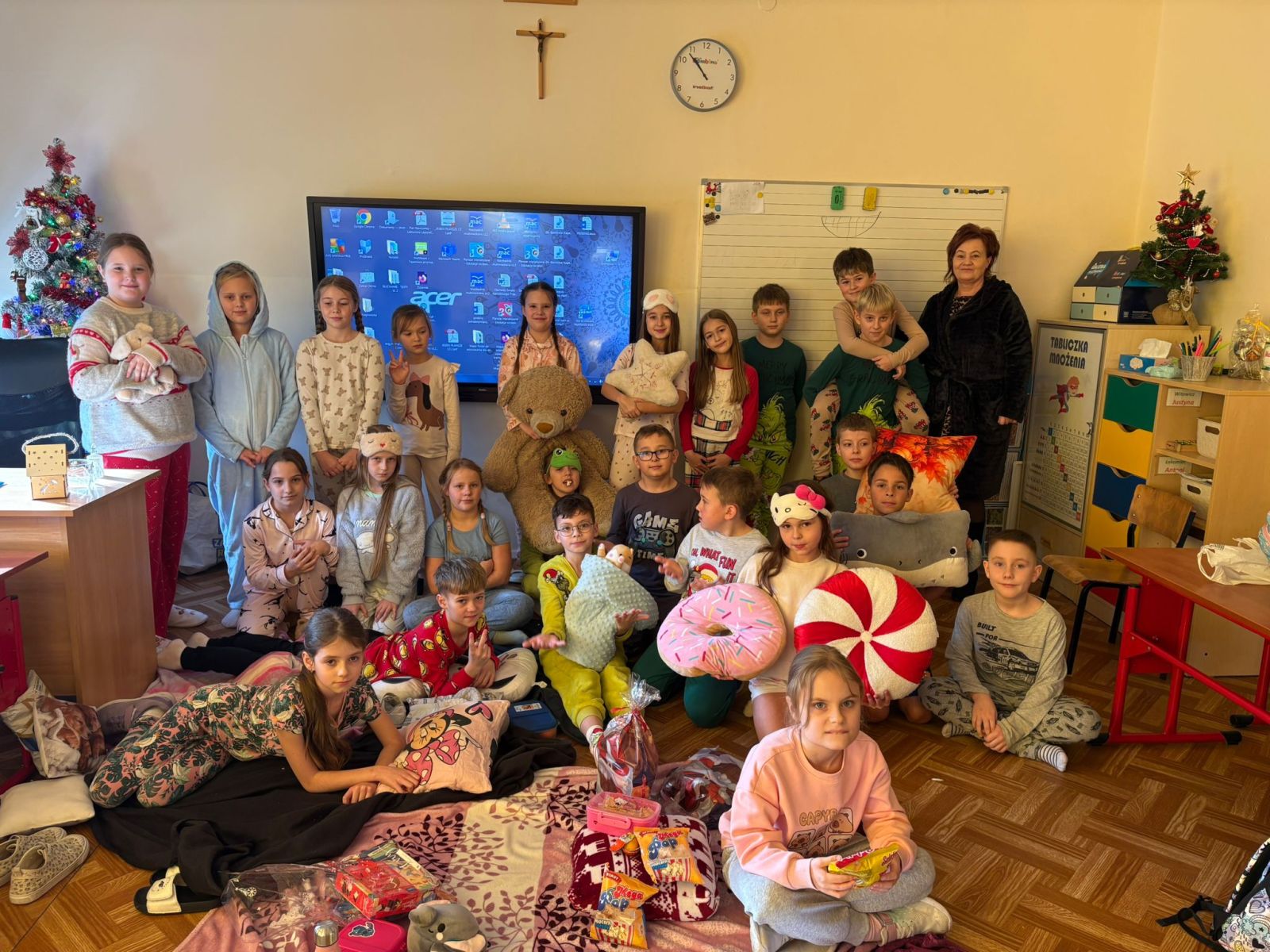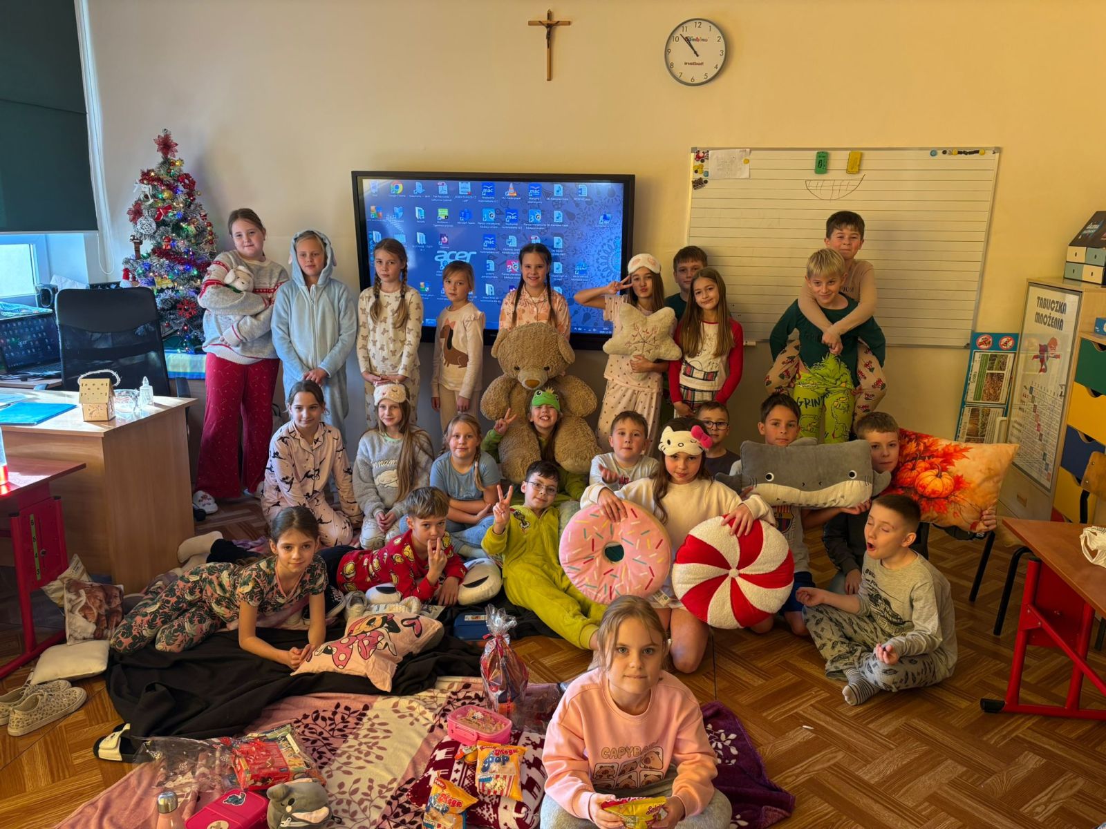 Dnia 5.12.2025 r. Samorząd Uczniowski zainicjował w naszej szkole Dzień Piżamy. Tego dnia korytarze i sale lekcyjne wypełniły się kolorowymi piżamami, szlafrokami, opaskami na oczy oraz pluszakami. Uczniowie chętnie włączyli się w akcję, prezentując swoje pomysłowe i niezwykle różnorodne stroje.