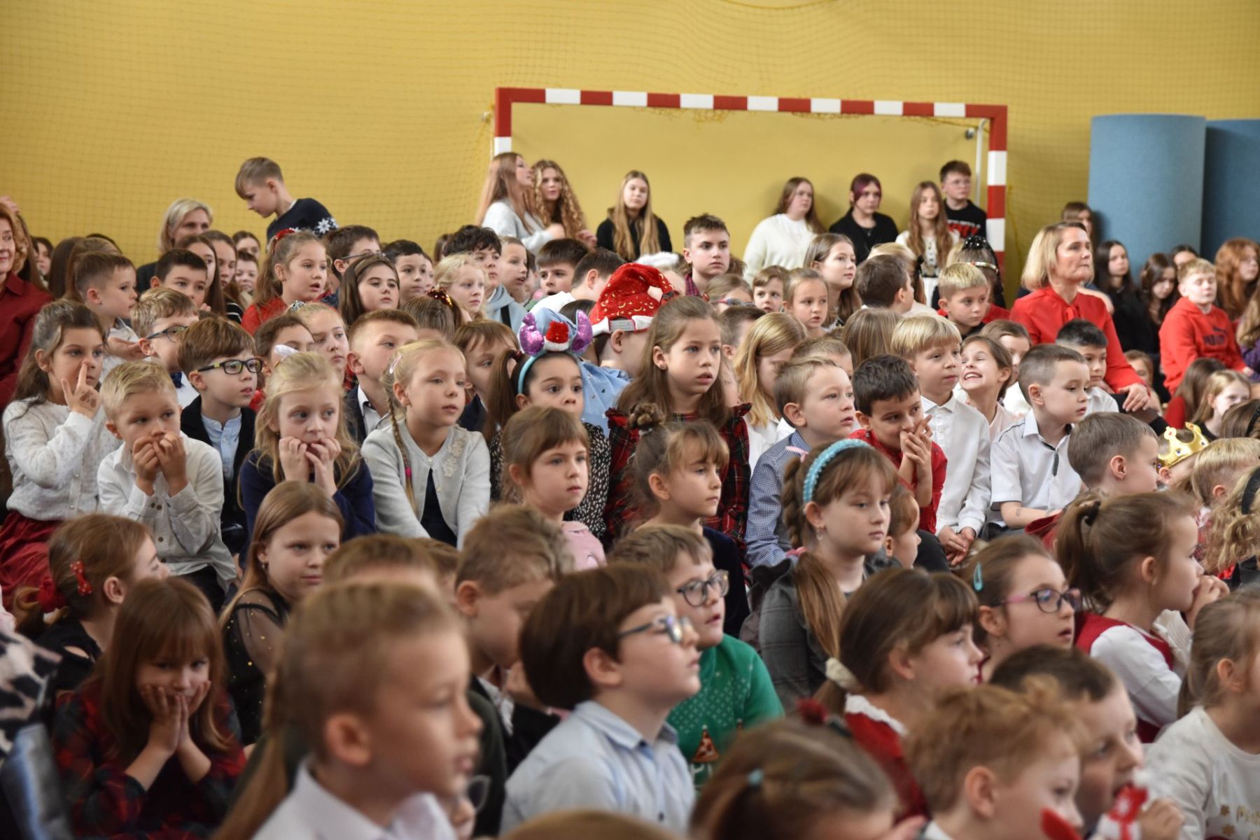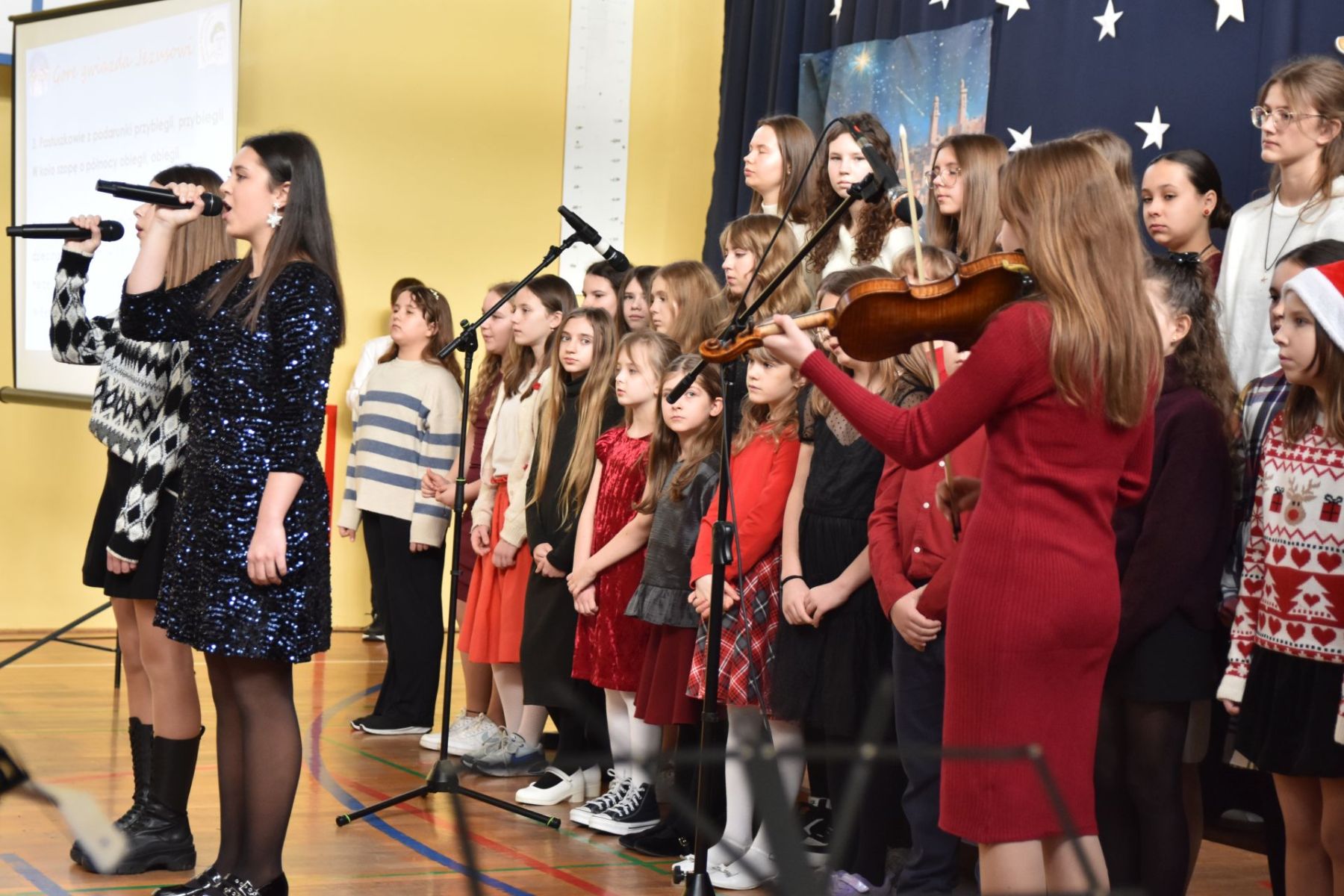 Następnie, w radosnym kolędowym nastroju, odbyło się wielkie świąteczne muzykowanie. Wybrzmiały tradycyjne kolędy oraz współczesne pastorałki w wykonaniu uczniów ze szkolnej grupy wokalnej, klasy 3b oraz utalentowanych instrumentalistów.