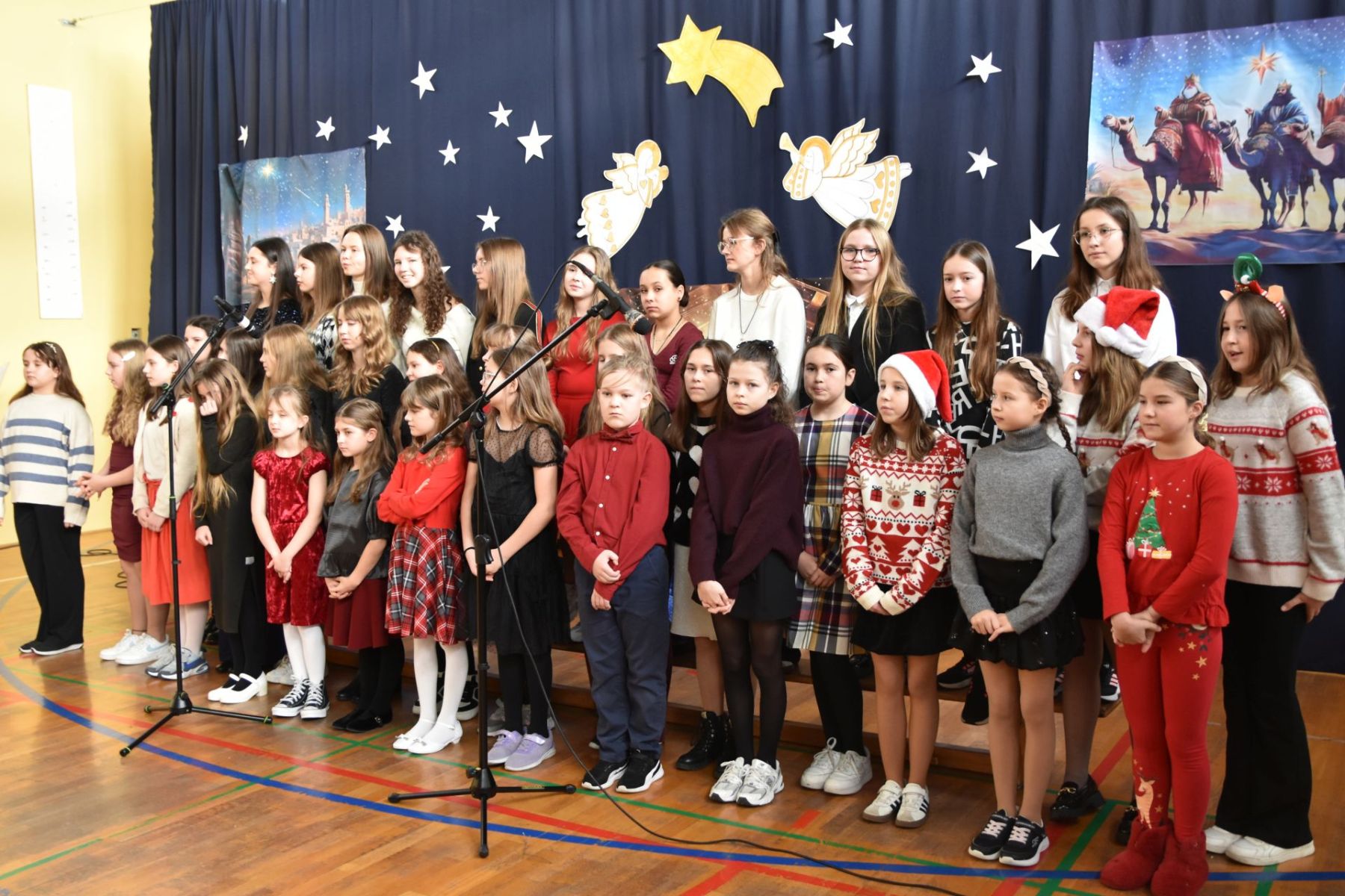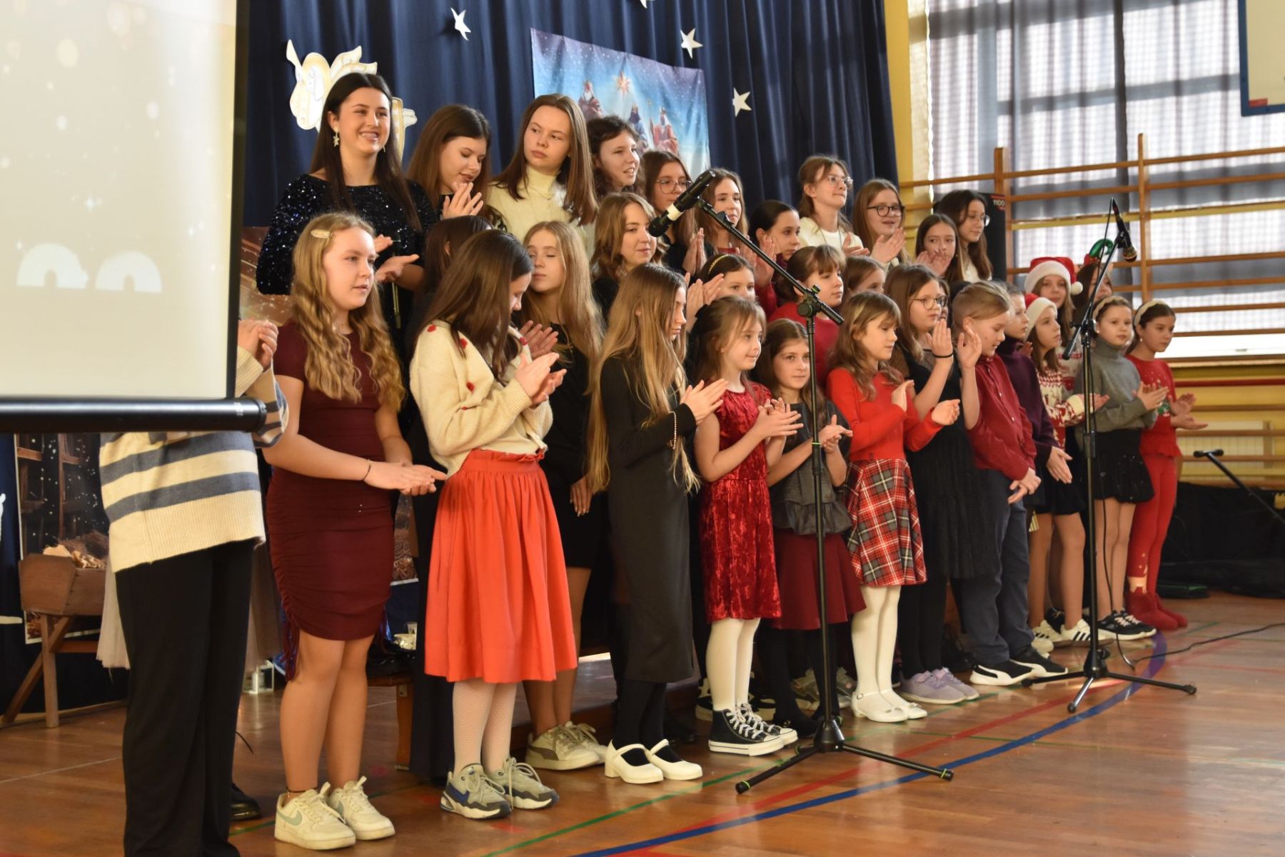 A ponieważ w naszej szkole nie brakuje różnorodnych talentów, repertuar koncertu był niezwykle bogaty. Na scenie jako pierwsze zaprezentowane zostały tradycyjne jasełka, urozmaicone pięknym tańcem i śpiewem, przygotowane przez klasę 3a.